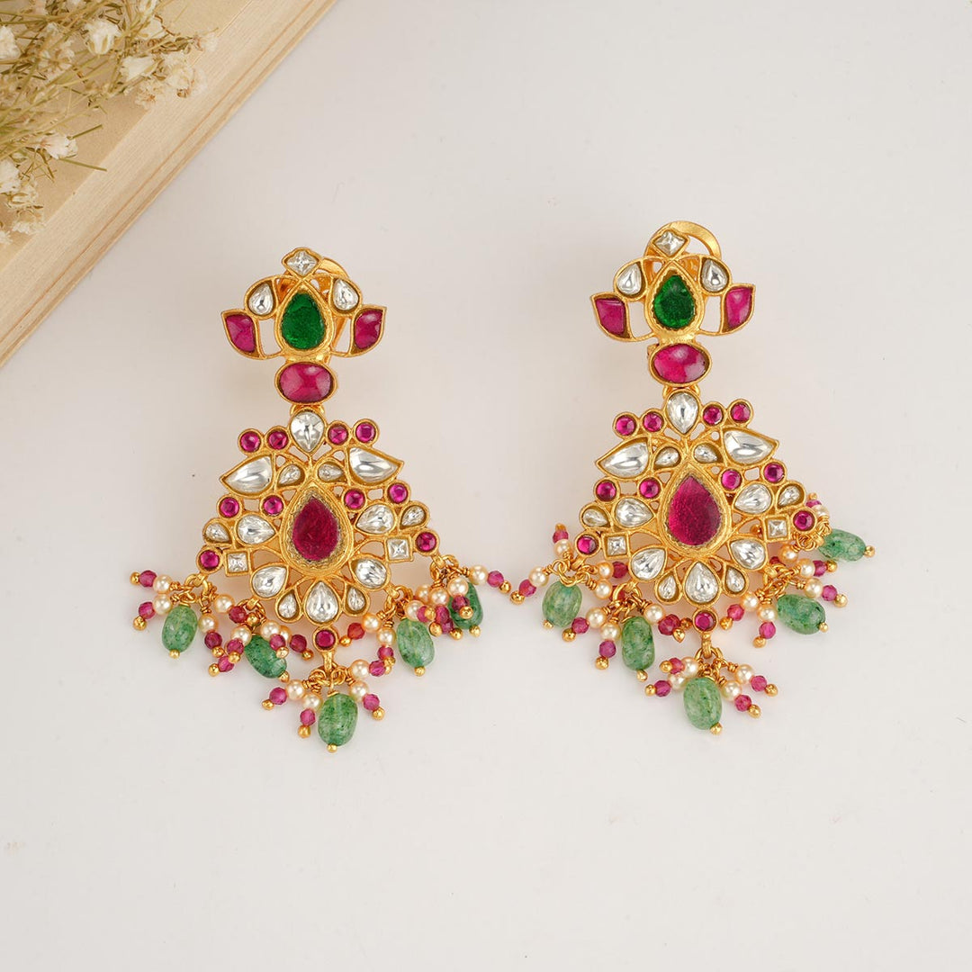 This 92.5 Silver, 24 kt Gold-Plated Earring is adorned with Semi-precious Kundan Stones for a luxurious aesthetic.