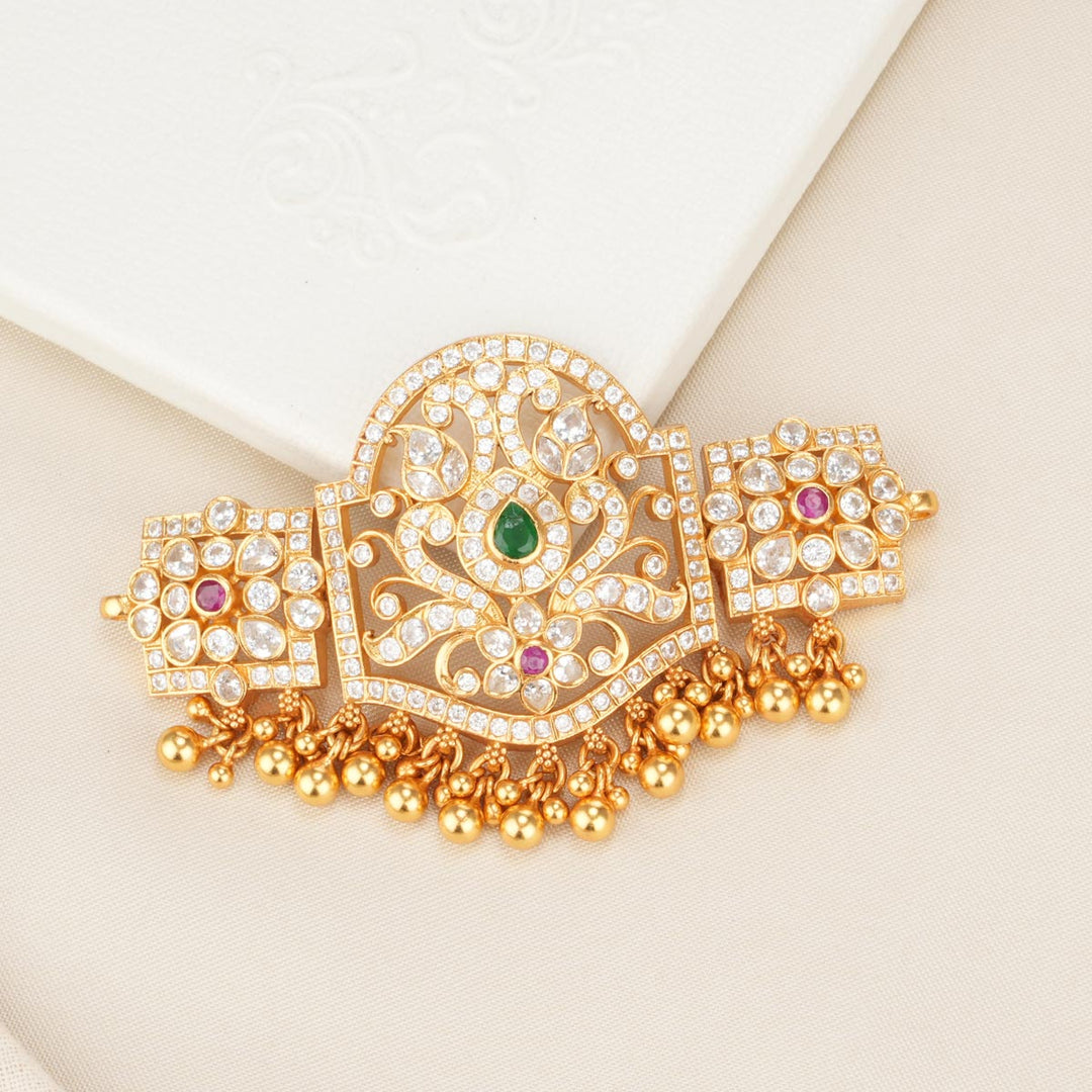 This 92.5 Silver, 24 kt gold-plated stylish Necklace is studded with semi-precious stones to make a stunning statement. Perfect for any special occasion.