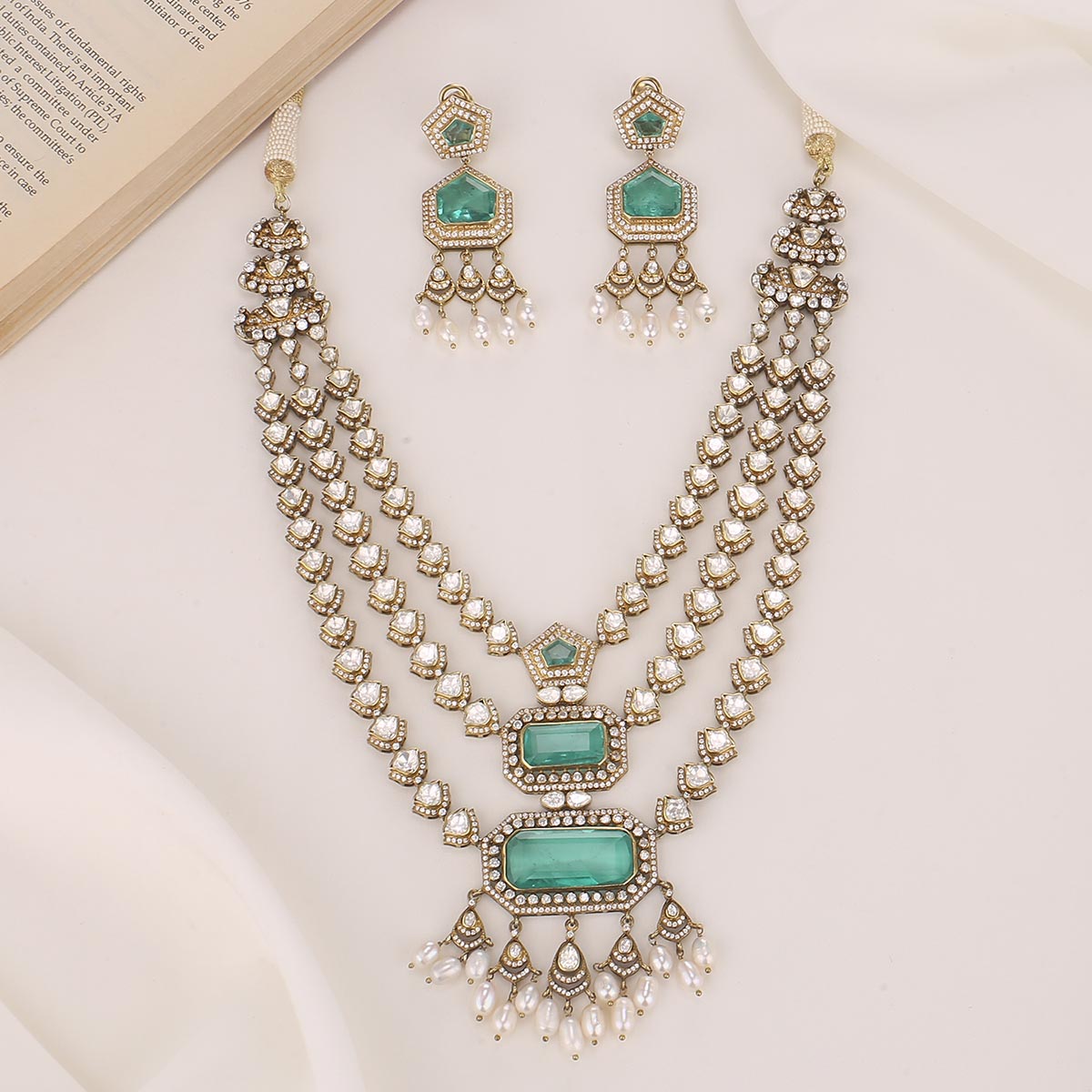This necklace Set is crafted from 92.5 Sterling Silver and features 24-karat gold plating.
