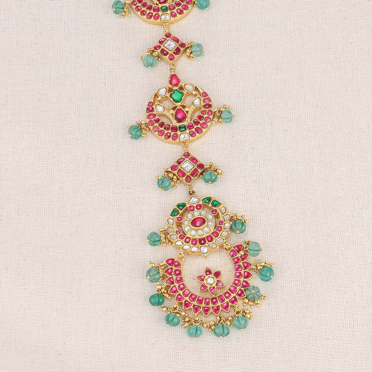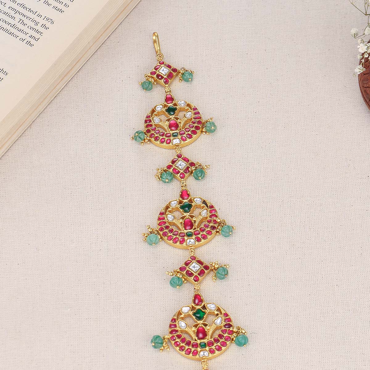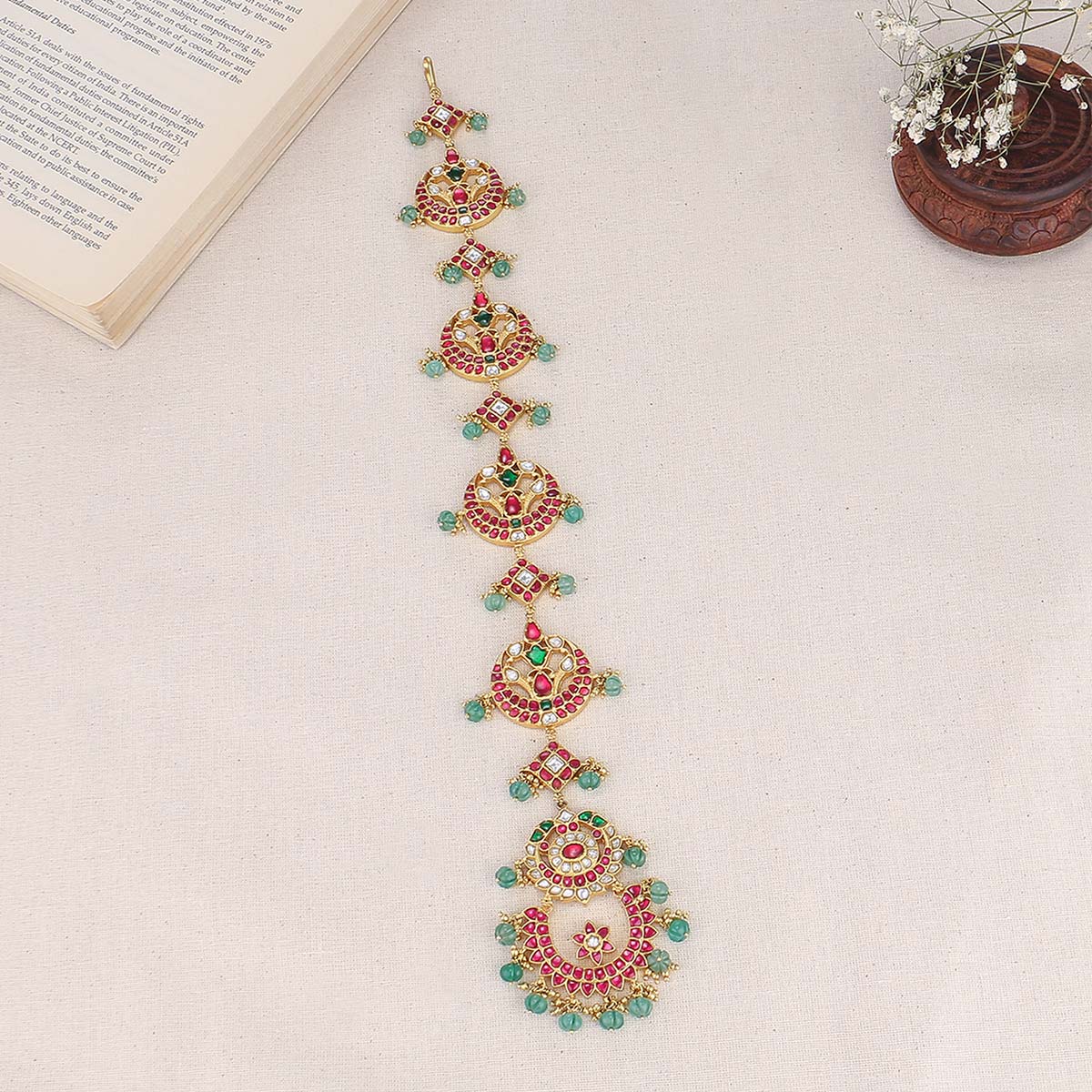 This Gorgeous Kundan Jada is crafted with 92.5 Silver and 24Kt Gold-plating and is adorned with Semi Precious Stones.