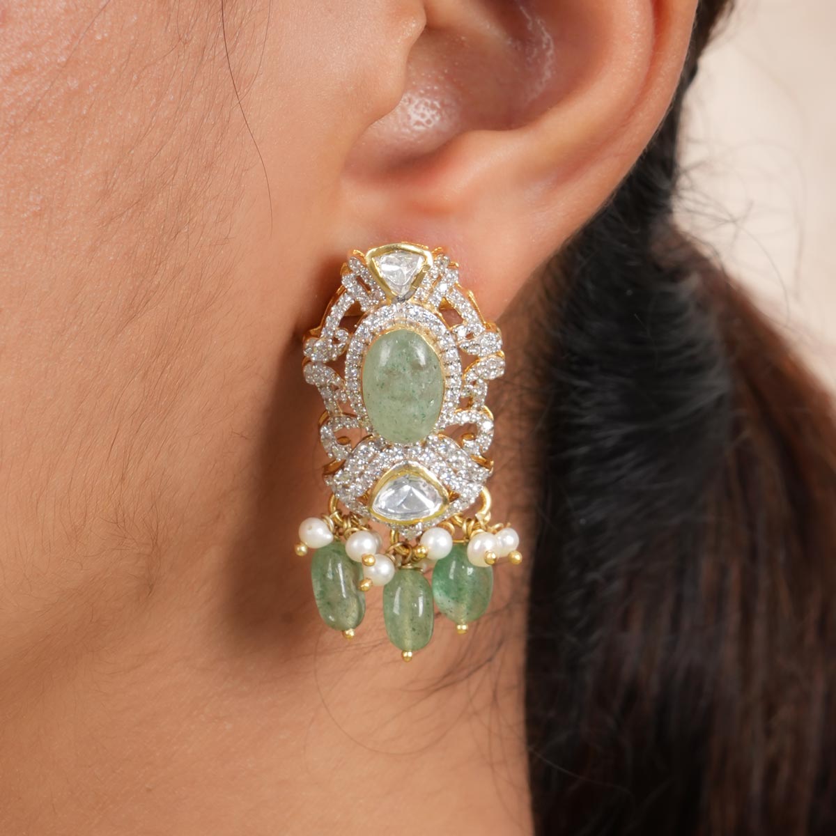This 92.5 Silver, 24 kt gold-plated stylish Necklace set is studded with semi-precious stones to make a stunning statement. Perfect for any special occasion.