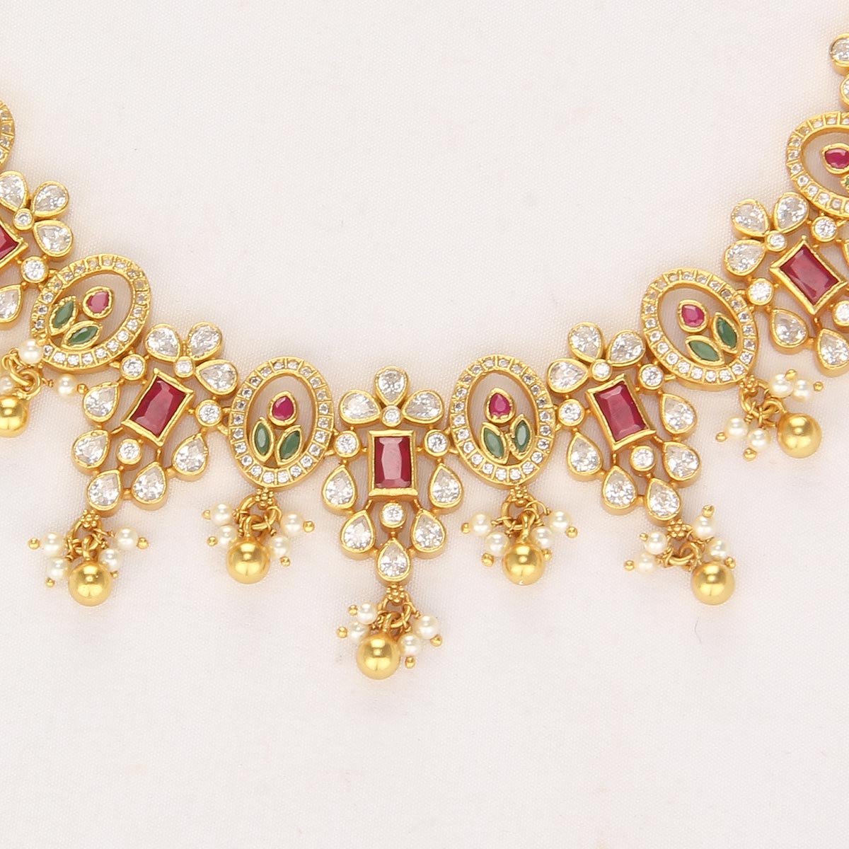 This necklace is crafted from 92.5 Sterling Silver and features 24-karat gold plating as well as semiprecious stones.