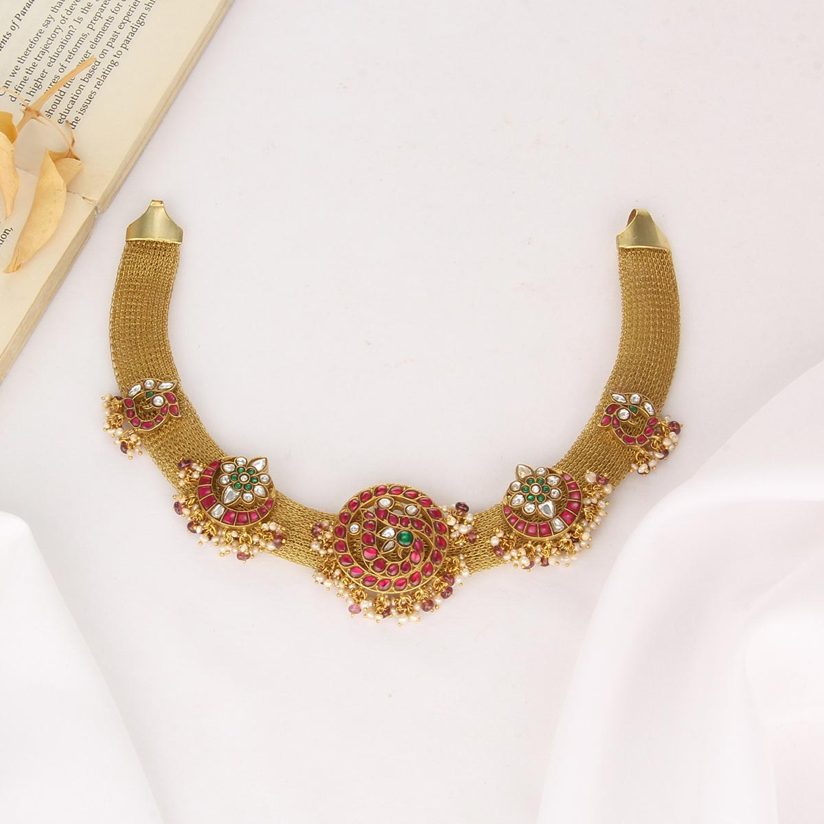 This 92.5 Silver, 24kt gold-plated necklace is adorned with semi-precious kundan stones for a luxurious aesthetic.