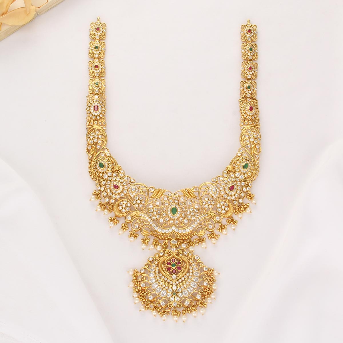 This 92.5 Silver, 24 kt gold-plated, stylish Necklace is studded with semi-precious stones to make a stunning statement. Perfect for any special occasion.