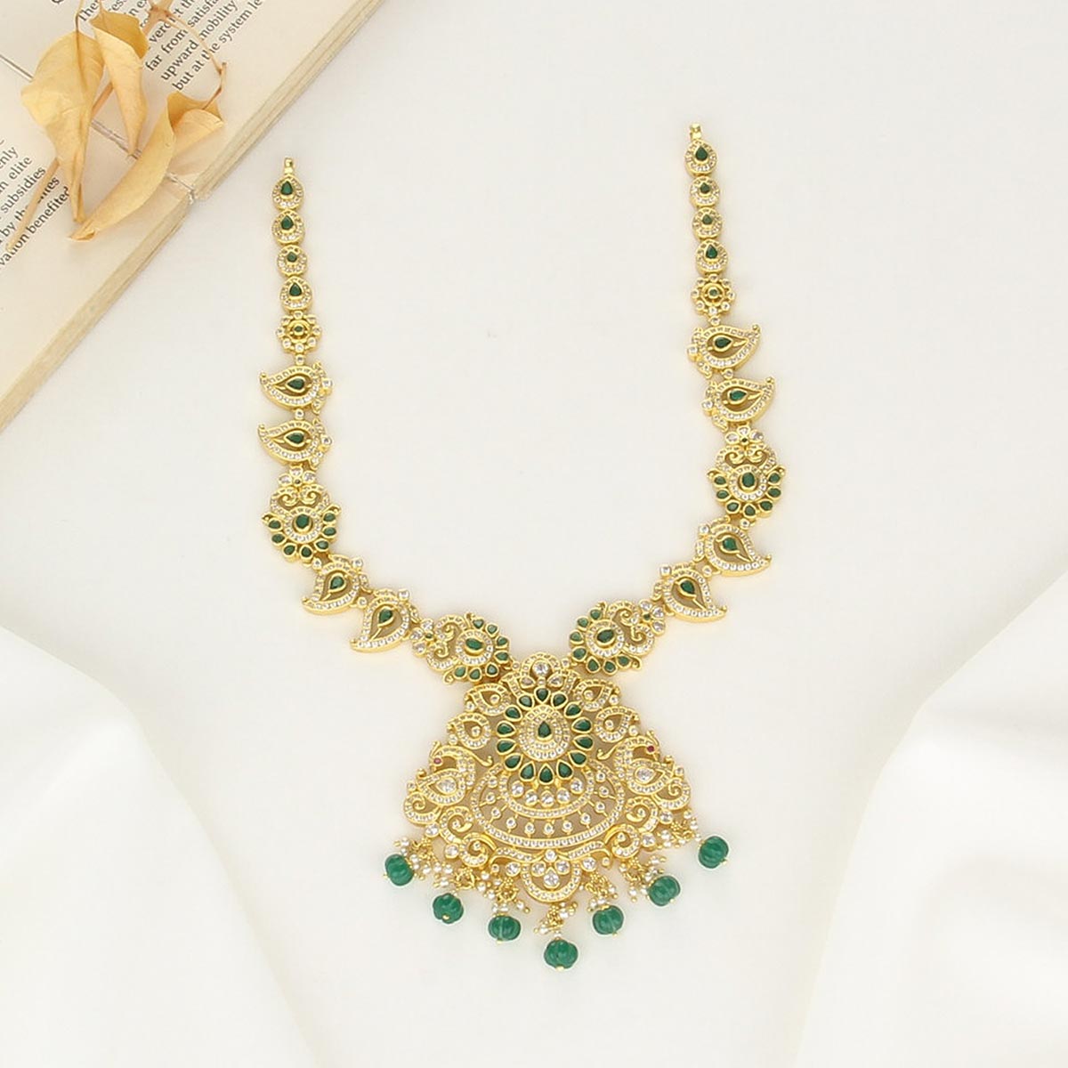 This 92.5 Silver, 24 kt gold-plated, This Necklace is studded with semi-precious stones to make a stunning statement. Perfect for any special occasion.