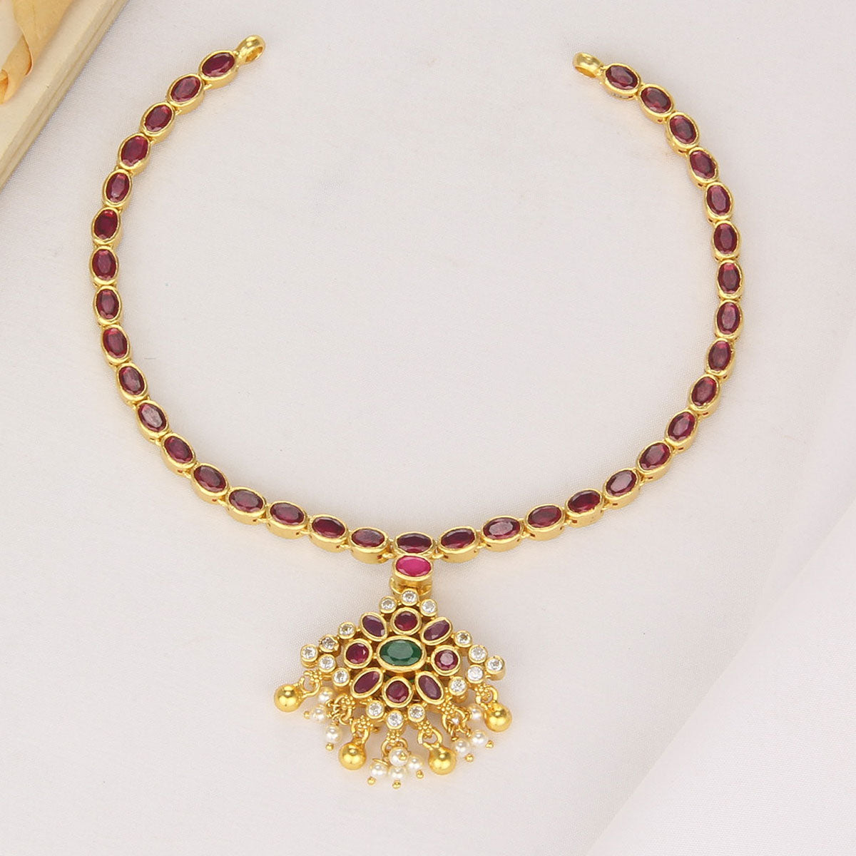 This 92.5 Silver, 24 kt gold-plated, stylish Necklace is studded with semi-precious stones to make a stunning statement. Perfect for any special occasion.