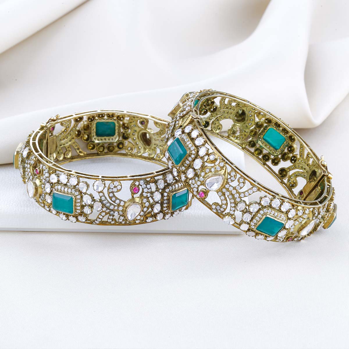 92.5 Silver, Victorian Pair Bangles studded with Gem Stones and Pearl Beads.