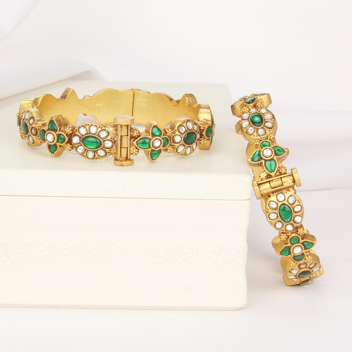 This 92.5 Silver, 24 kt Gold-Plated Bangles is adorned with Semi-precious Kundan Stones for a luxurious aesthetic.