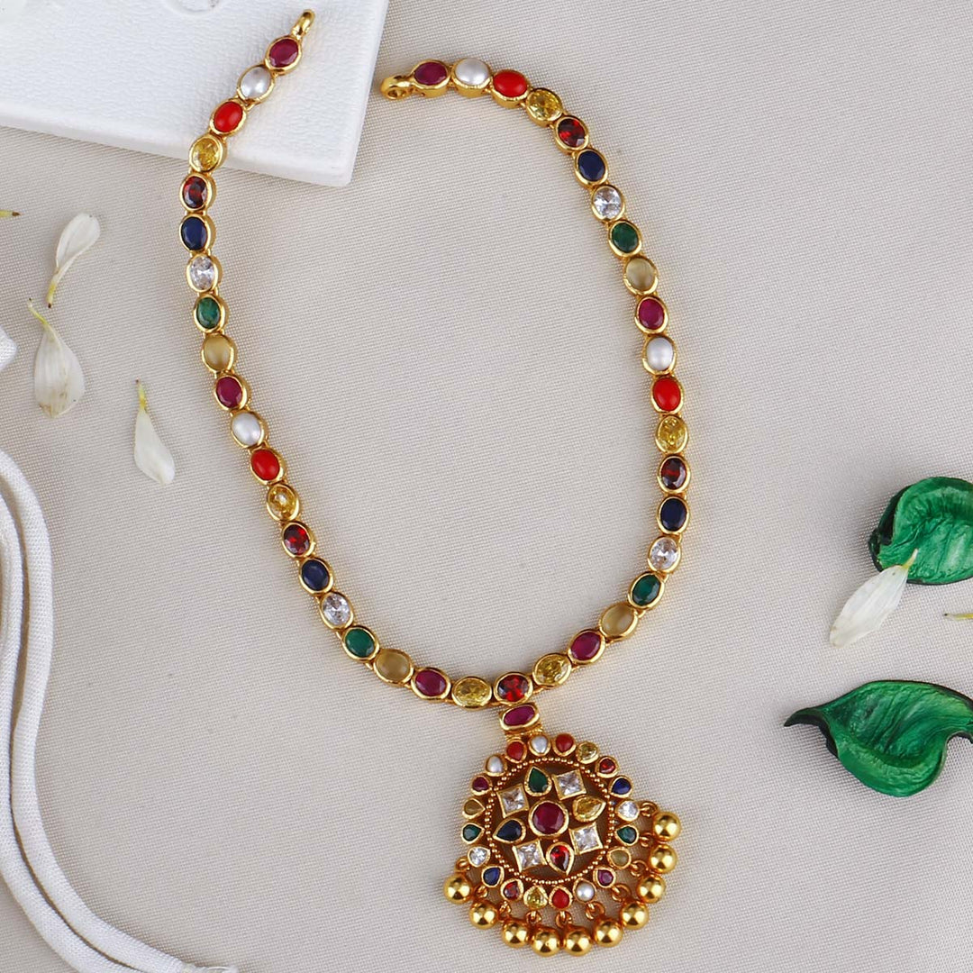 This 92.5 Silver, 24 kt gold-plated stylish Necklace is studded with semi-precious stones to make a stunning statement. Perfect for any special occasion.