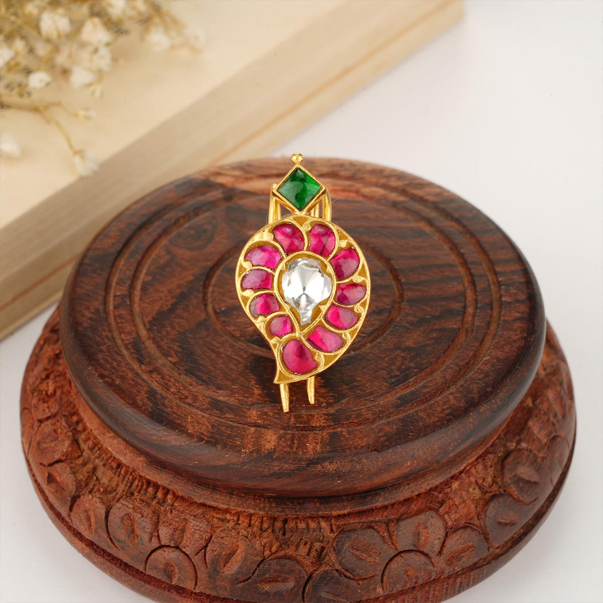 This 92.5 Silver, 24 kt Gold-Plated Jada Billa is adorned with Semi-precious Kundan Stones for a luxurious aesthetic.