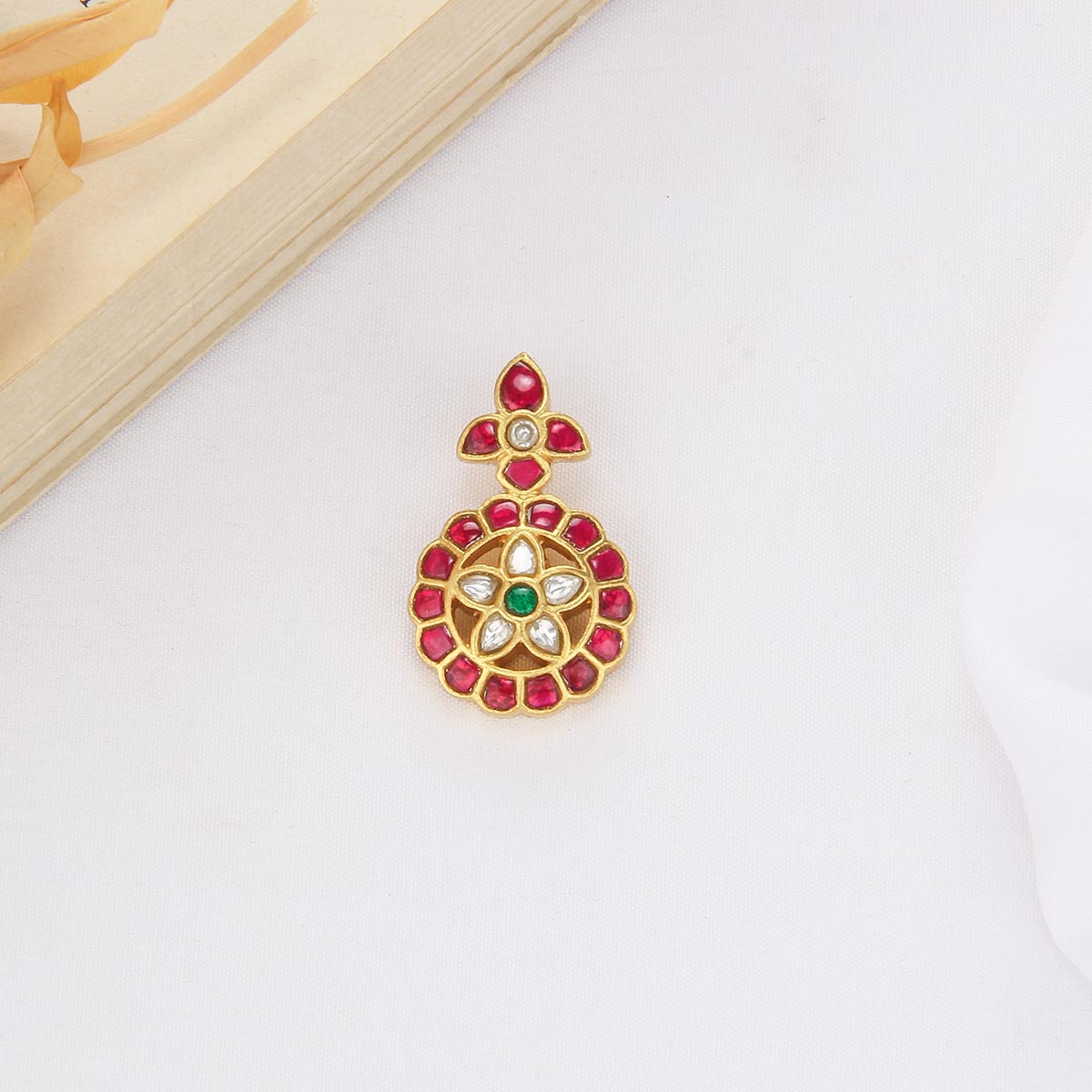 This 92.5 Silver, 24 kt Gold-Plated Pendant is adorned with Semi-precious Kundan Stones for a luxurious aesthetic.