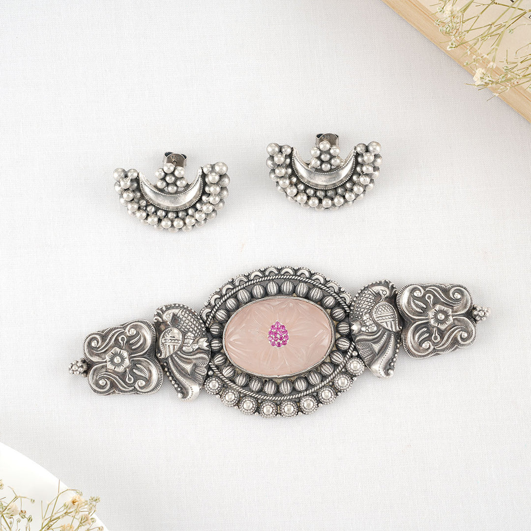 This beautiful Choker set is perfect for any occasion. Crafted from 92.5 sterling silver and oxidized for a unique look, these pretty chokers are studded with semi-precious stones for added sparkle.