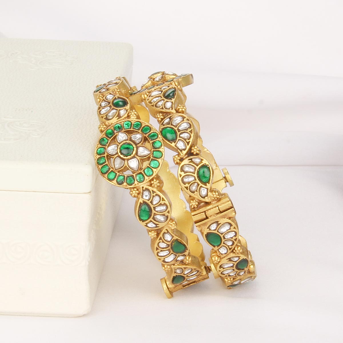 This 92.5 Silver, 24 kt Gold-Plated Bangles is adorned with Semi-precious Kundan Stones for a luxurious aesthetic.