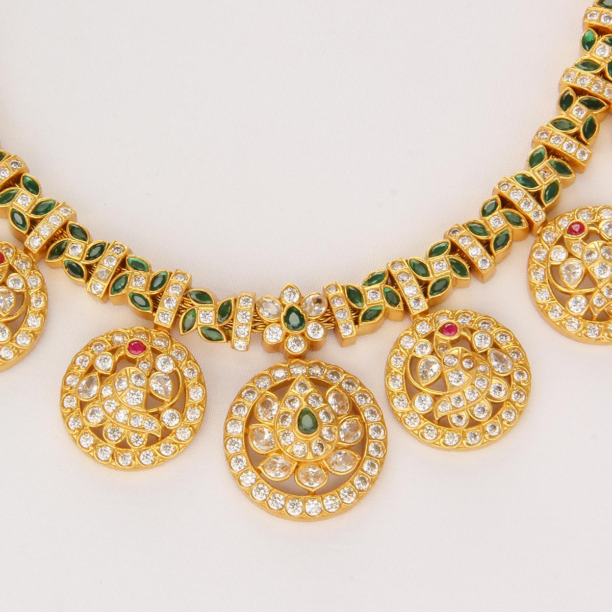 This necklace set is crafted from 92.5 Sterling Silver and features 24-karat gold plating and semiprecious stones.