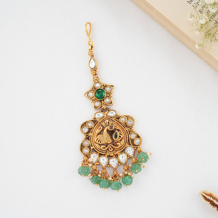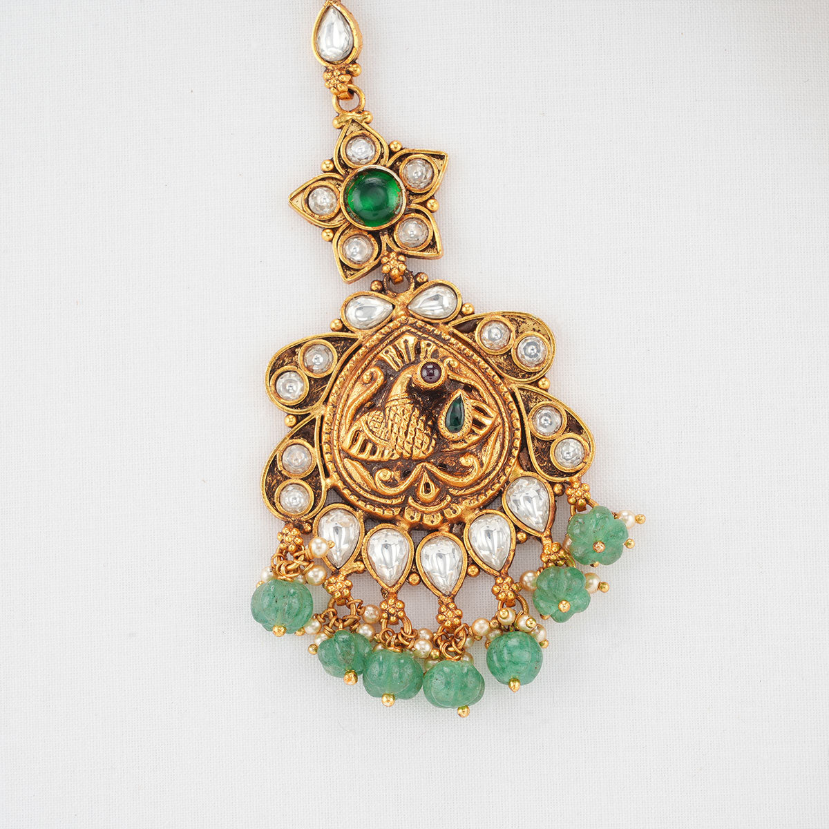 92.5 Silver, gold-plated deep nagas maangtikka studded with moissanite stone. Delicately Handcrafted, This is a fusion of deep nagas and moissanite one-of-a-kind masterpiece.