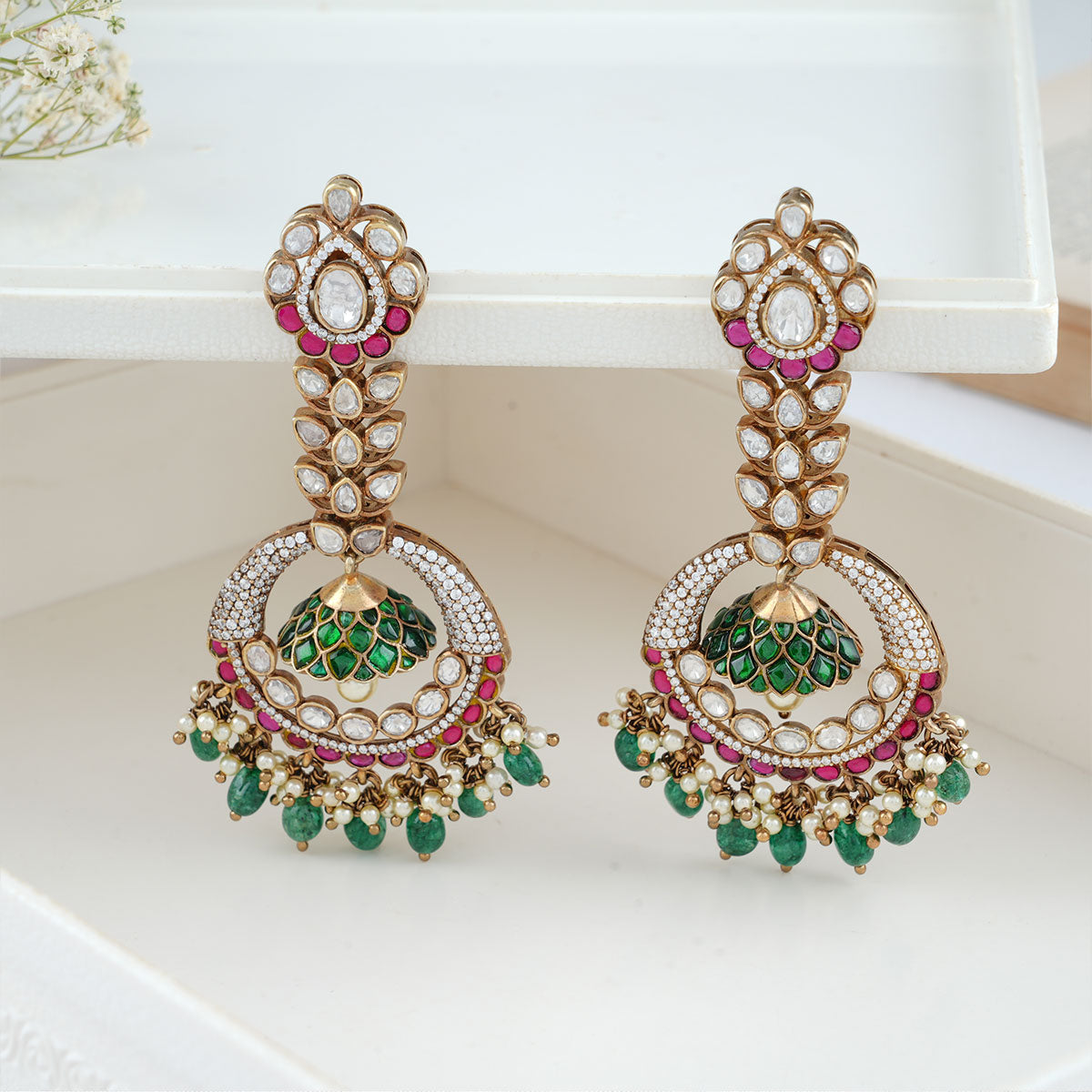 92.5 Silver, Victorian earrings studded with Gem Stones and Pearl Beads.