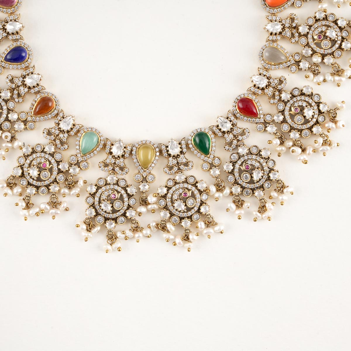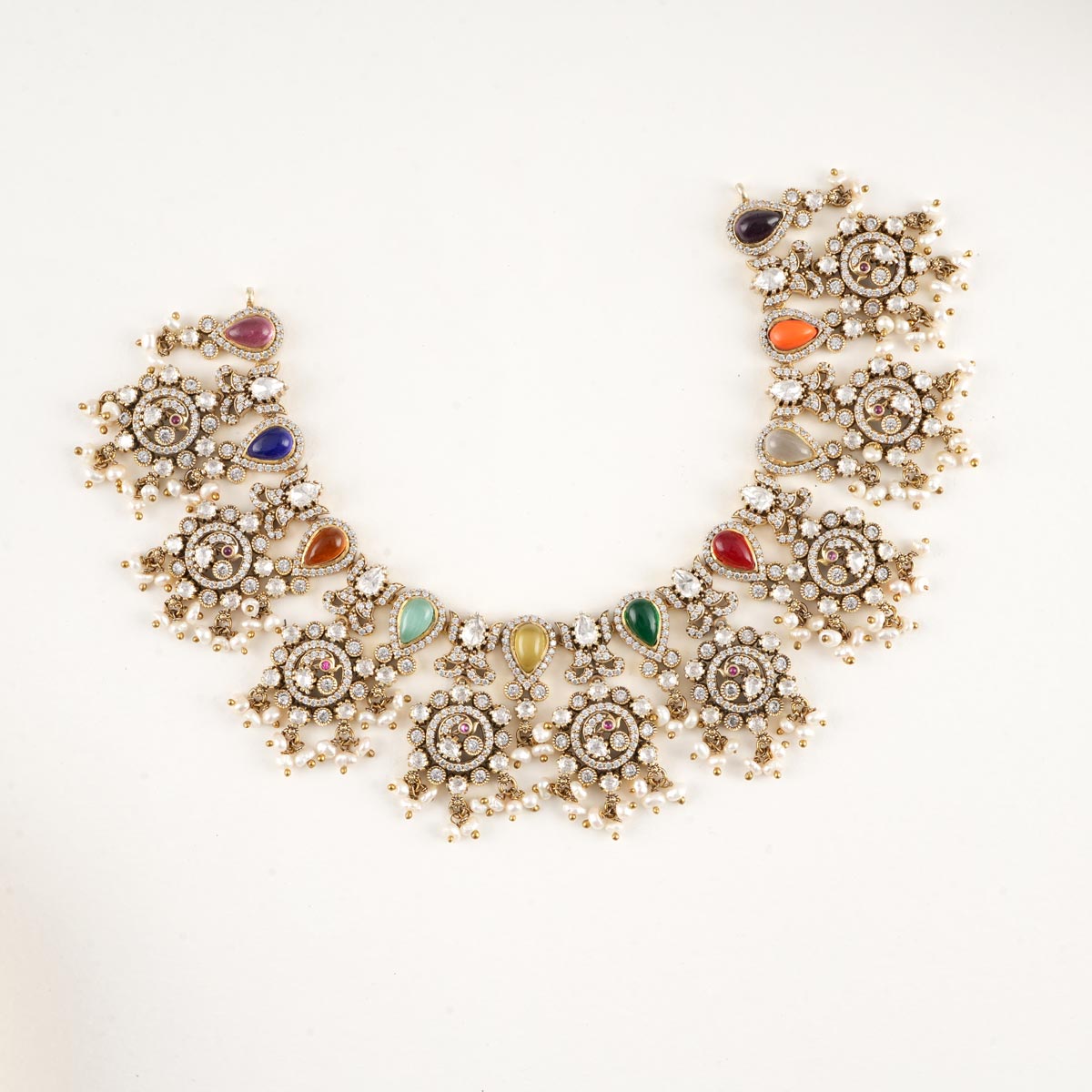 92.5 Silver, Victorian Necklace set studded with Gem Stones and Pearl Beads.