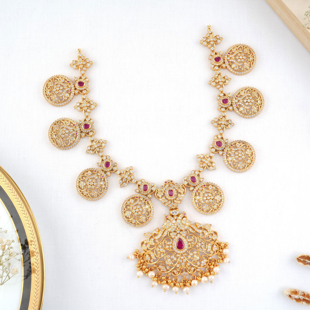This necklace is made from 92.5 Sterling Silver and boasts 24-karat gold plating and semiprecious stones.