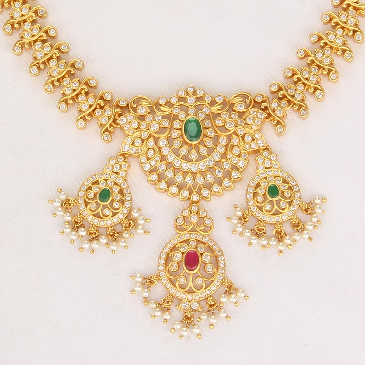 This 92.5 Silver, 24 kt gold-plated stylish Necklace is studded with semi-precious stones to make a stunning statement. Perfect for any special occasion.