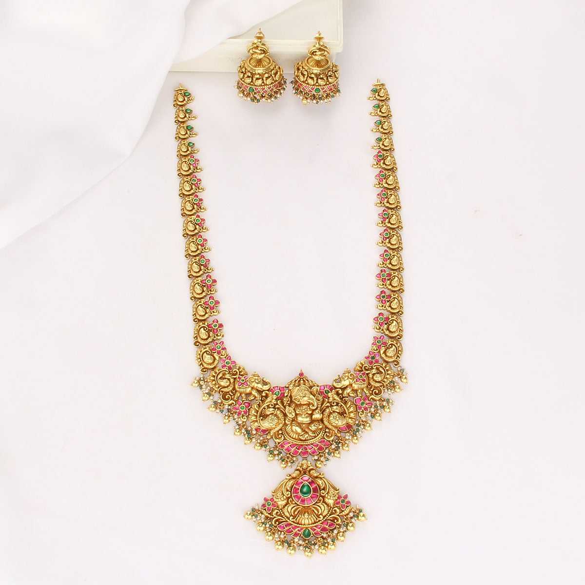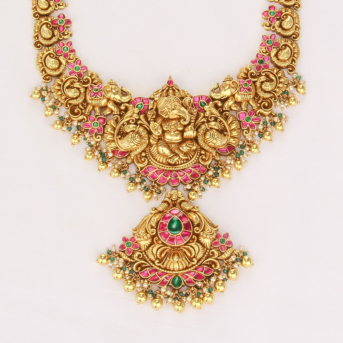 This set of Majestic Look Nagas necklaces is crafted from 92.5 Silver, 24kt Gold Plated, and is studded with semi-precious stones for a truly dazzling effect. Unparalleled in design and style, this exquisite set makes a grand statement.