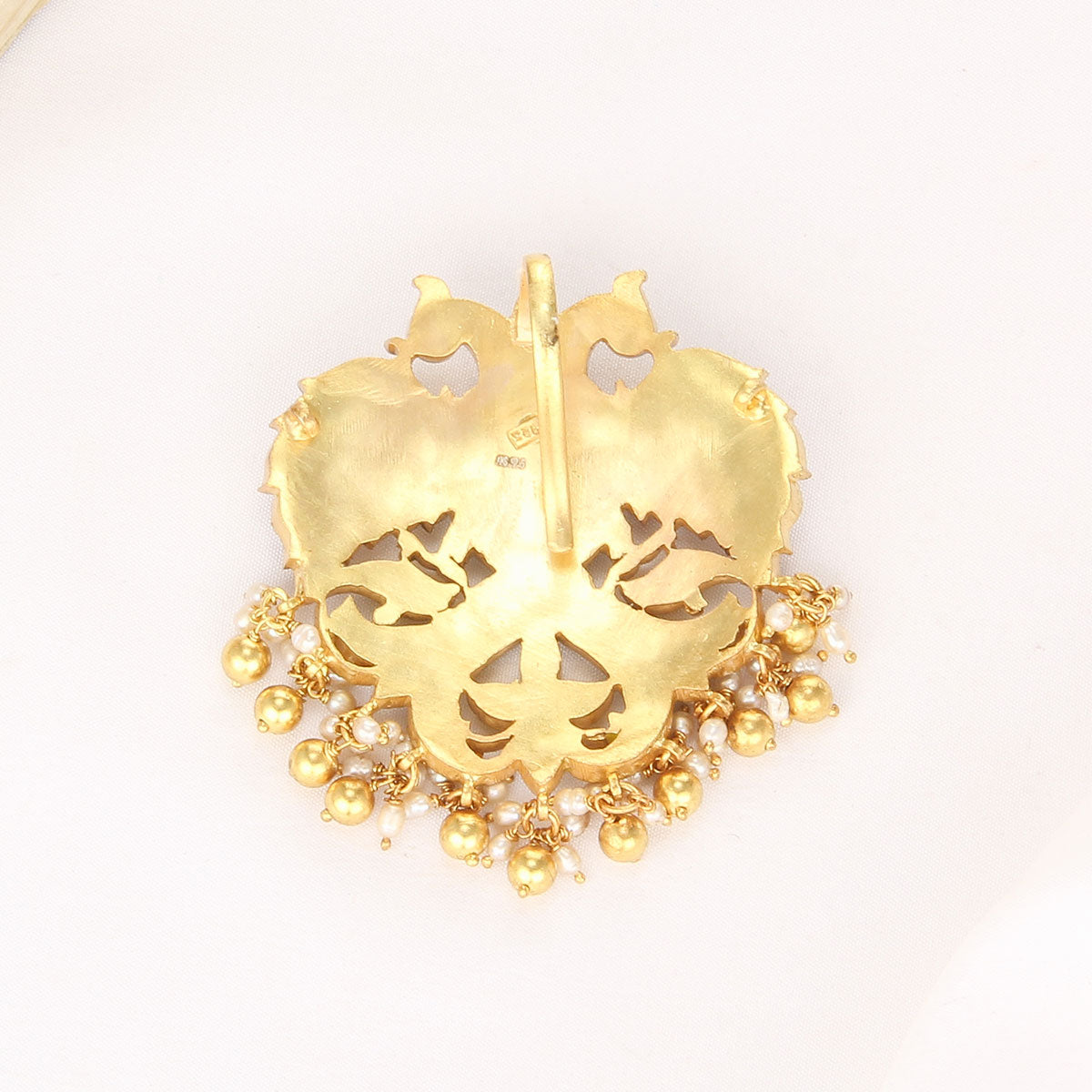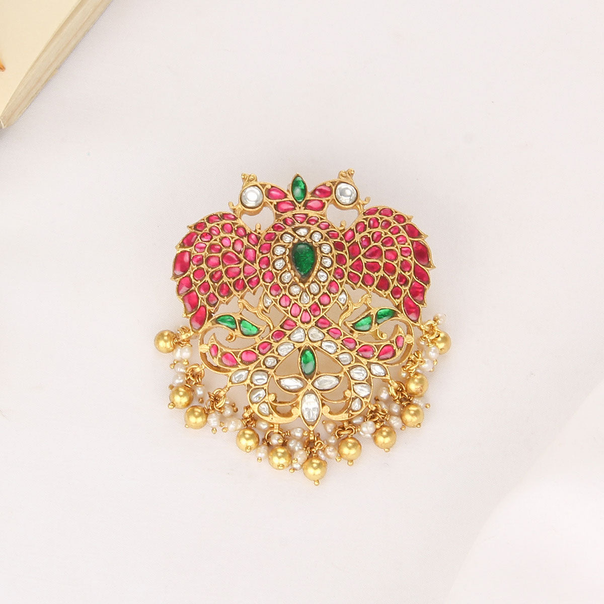 This 92.5 Silver, 24 kt Gold-Plated Pendant is adorned with Semi-precious Kundan Stones for a luxurious aesthetic.