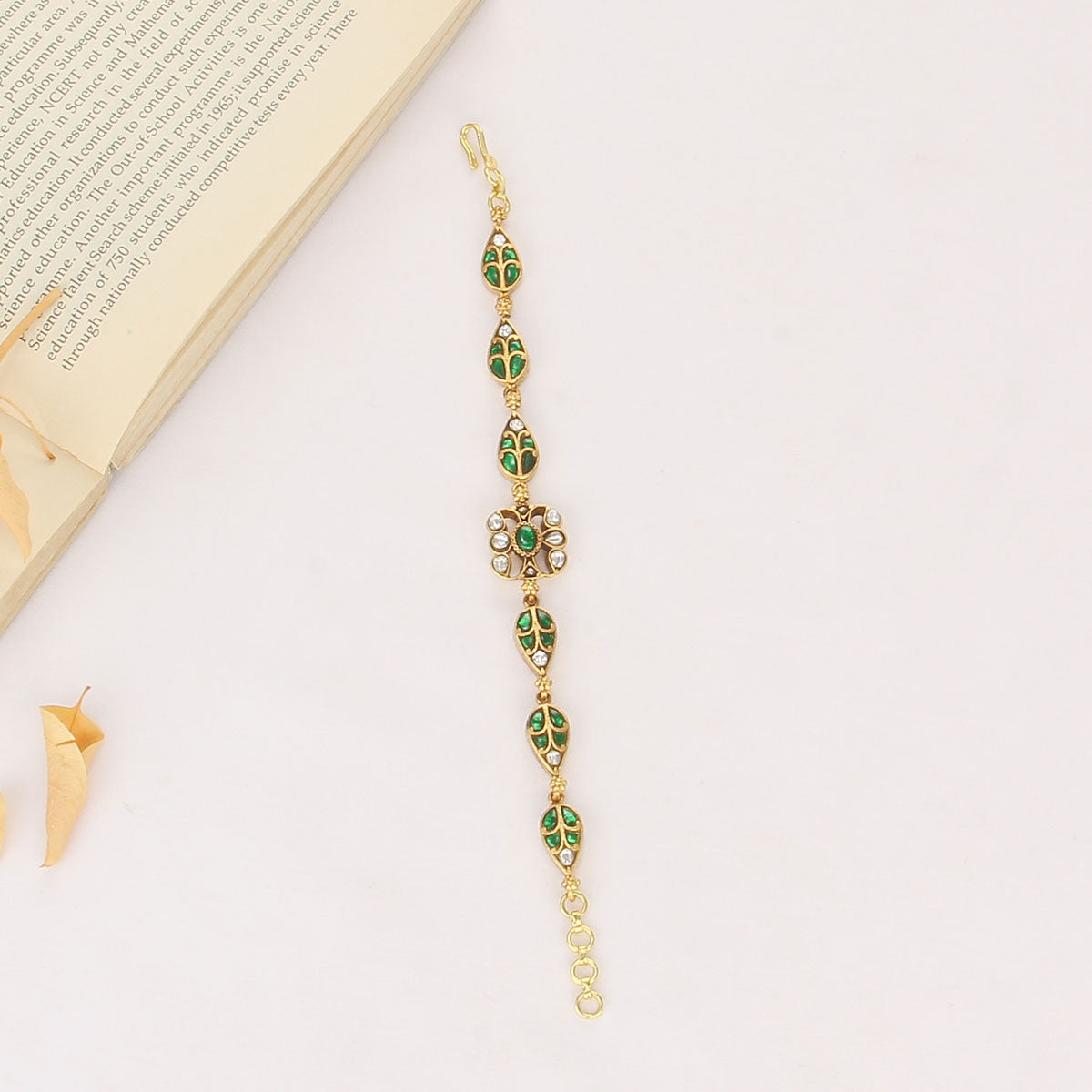 This 92.5 Silver, 24 kt Gold-Plated bracelet is adorned with Semi-precious Kundan Stones for a luxurious aesthetic.