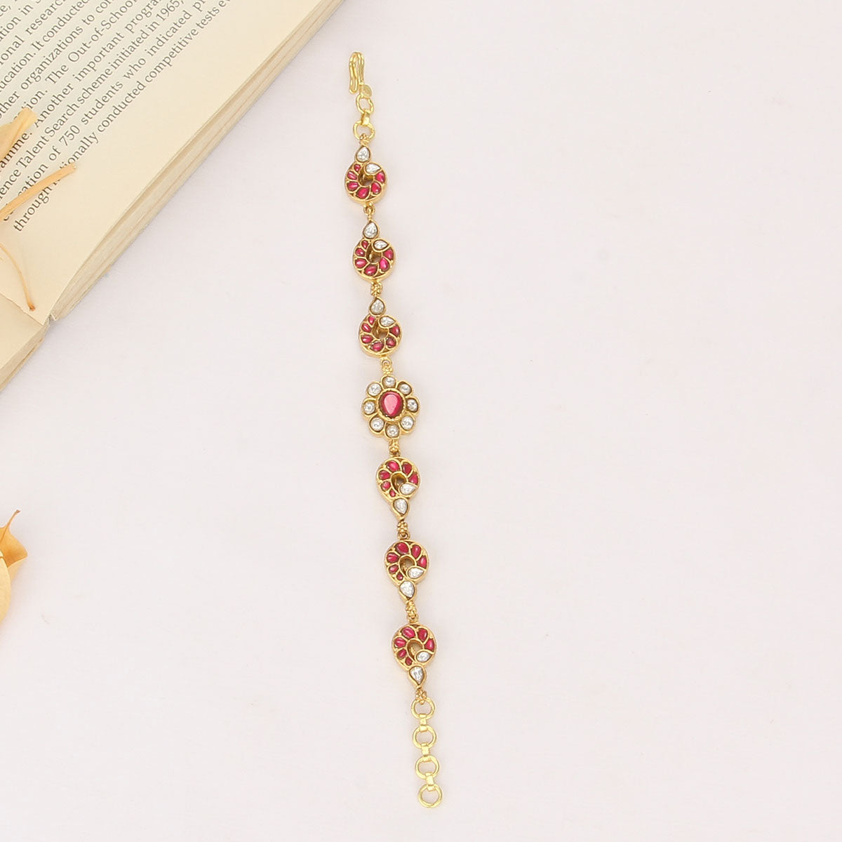 This 92.5 Silver, 24 kt Gold-Plated bracelet is adorned with Semi-precious Kundan Stones for a luxurious aesthetic.