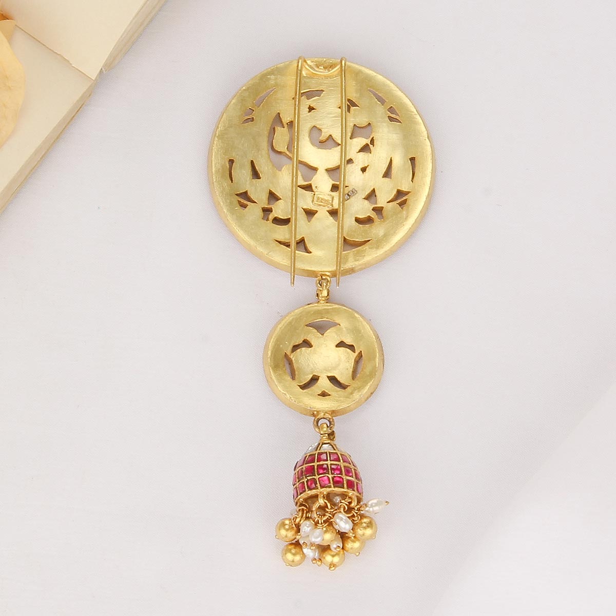 This 92.5 Silver, 24 kt Gold-Plated Jada Billa is adorned with Semi-precious Kundan Stones for a luxurious aesthetic.