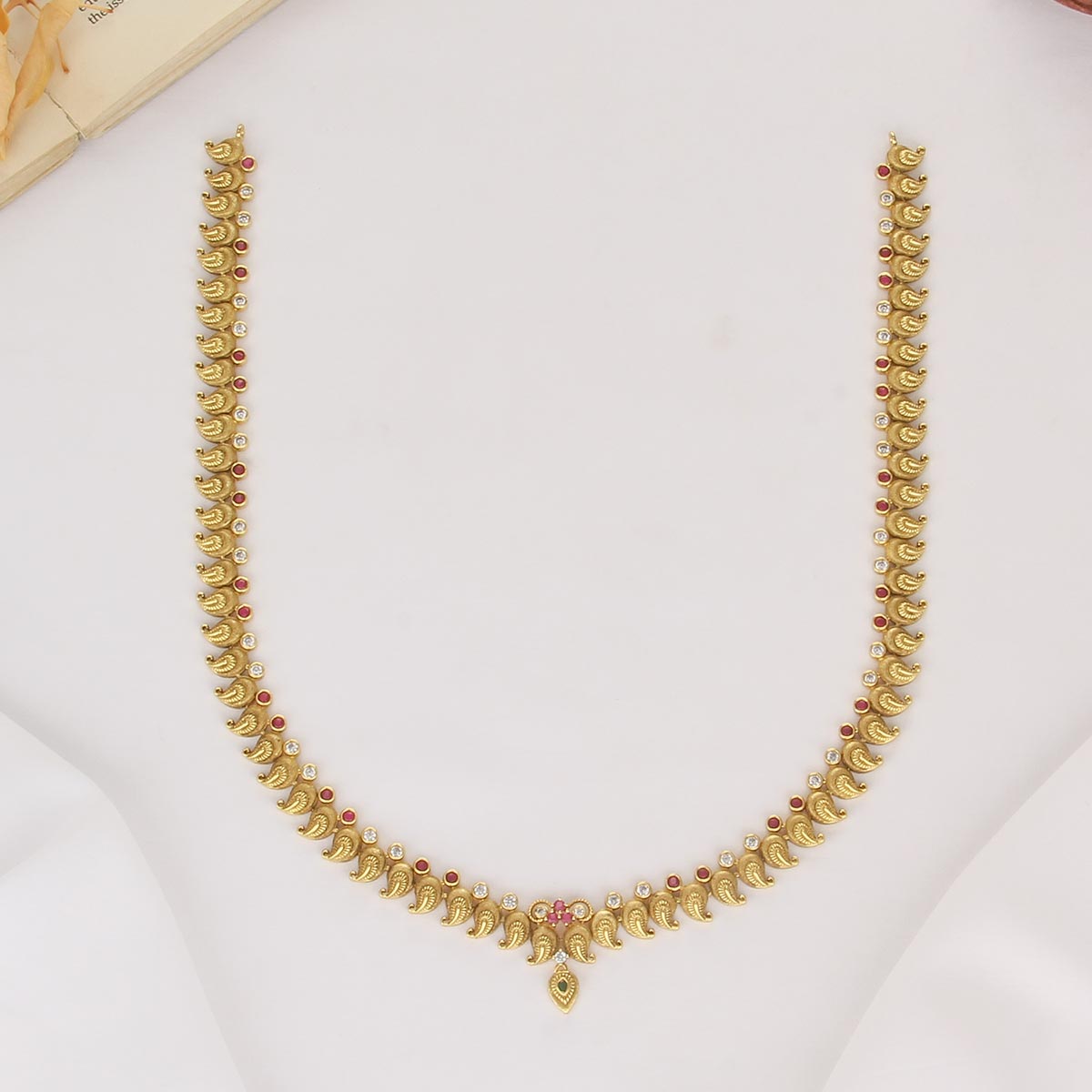 This 92.5 Silver, 24 kt gold-plated, stylish Necklace is studded with semi-precious stones to make a stunning statement. Perfect for any special occasion.