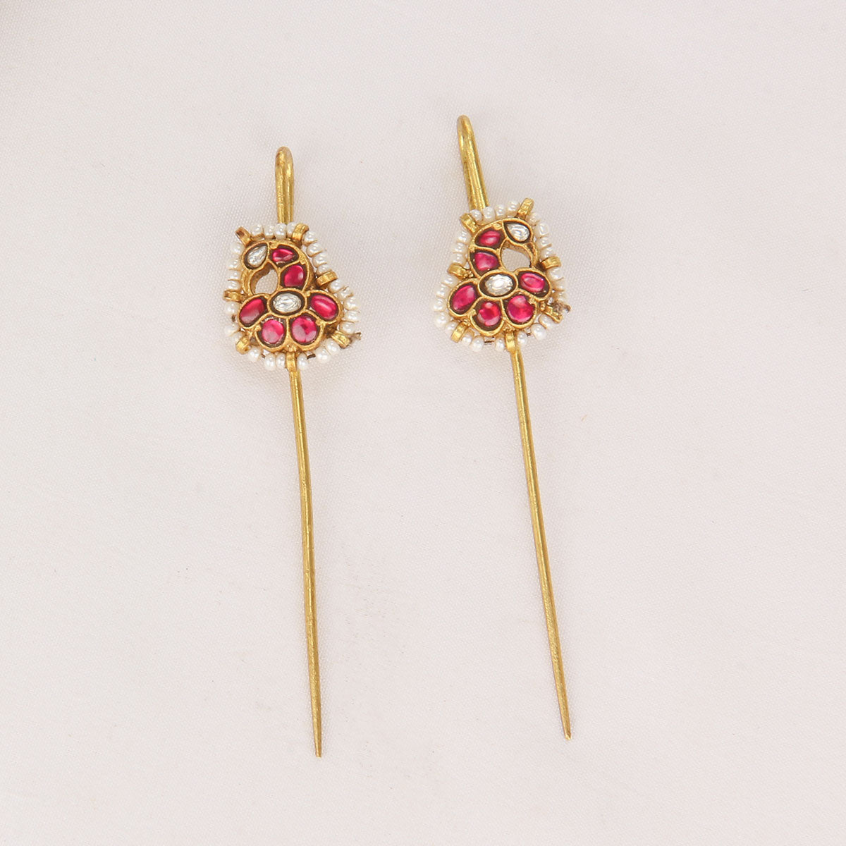 This 92.5 Silver, 24 kt Gold-Plated Earring is adorned with Semi-precious Kundan Stones for a luxurious aesthetic.