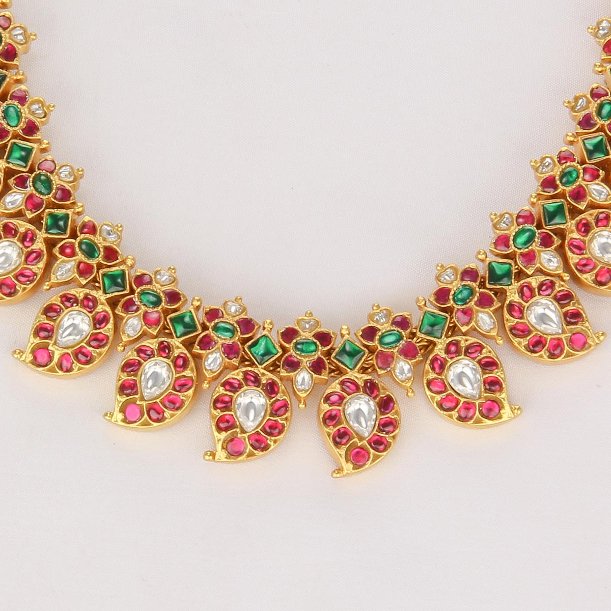 This 92.5 Silver, 24 kt Gold-Plated Necklace is adorned with Semi-precious Kundan Stones for a luxurious aesthetic.