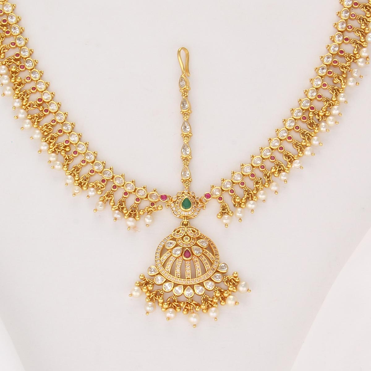 The Gold Plated Stone Maangtikka features 92.5 Silver, 24kt Gold plating and is studded with semi-precious stones. This premium piece of jewelry is perfect for formal, dressy occasions and provides a timeless look for a lasting impression.