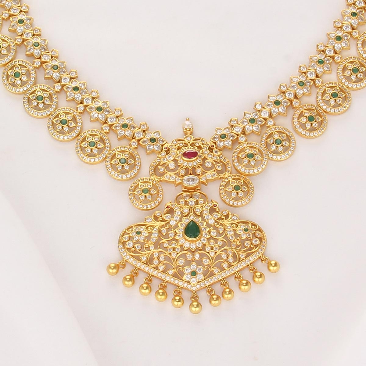 This 92.5 Silver, 24 kt gold-plated, stylish Necklace is studded with semi-precious stones to make a stunning statement. Perfect for any special occasion.