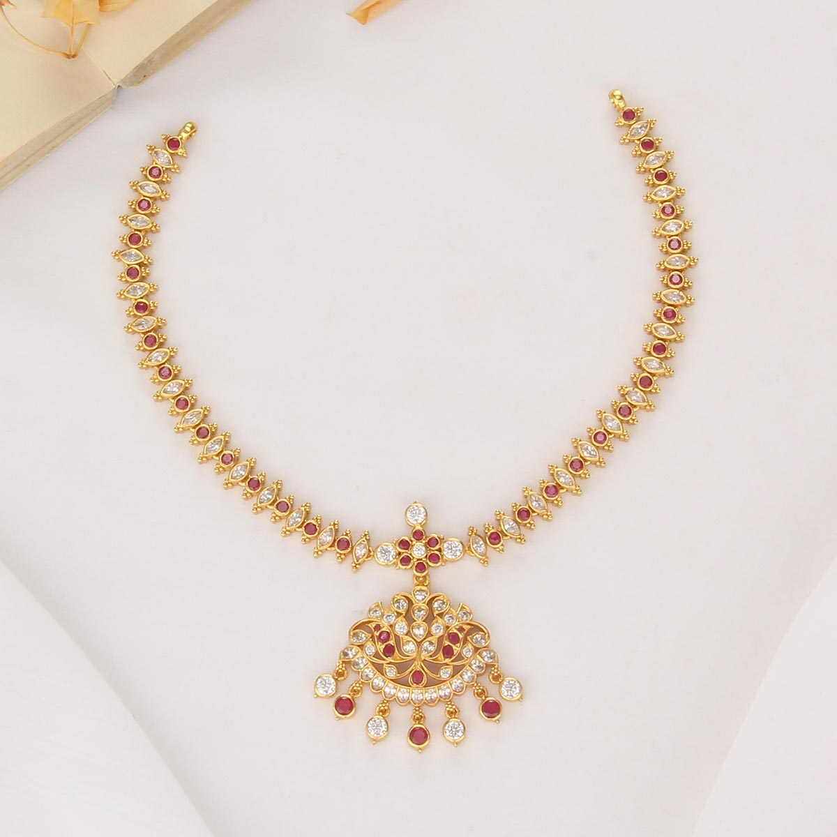 This 92.5 Silver, 24 kt gold-plated stylish Necklace is studded with semi-precious stones to make a stunning statement. Perfect for any special occasion.