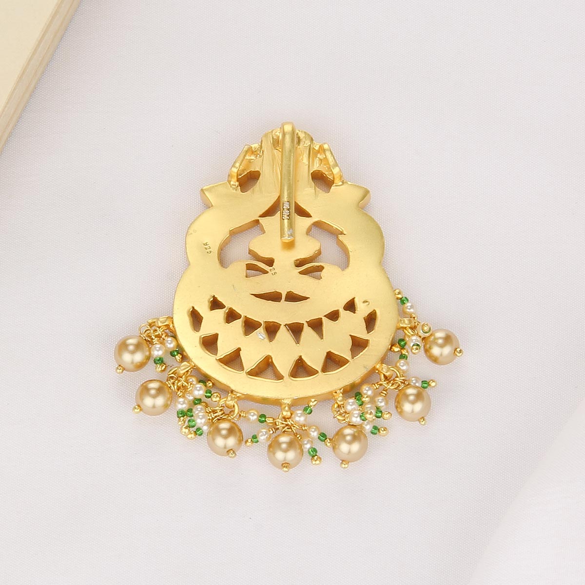 This 92.5 Silver, 24 kt Gold-Plated Pendant is adorned with Semi-precious Kundan Stones for a luxurious aesthetic.