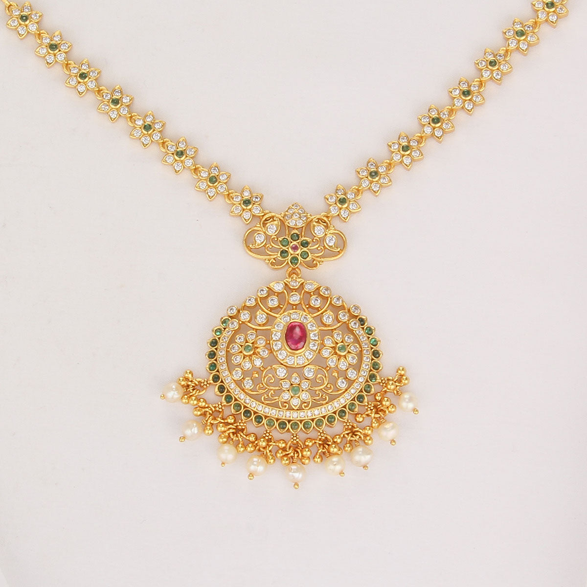 This 92.5 Silver, 24 kt gold-plated stylish Necklace is studded with semi-precious stones to make a stunning statement. Perfect for any special occasion.