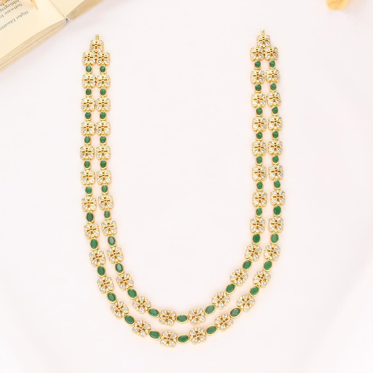 This 92.5 Silver, 24 kt gold-plated, stylish Necklace is studded with semi-precious stones to make a stunning statement. Perfect for any special occasion.