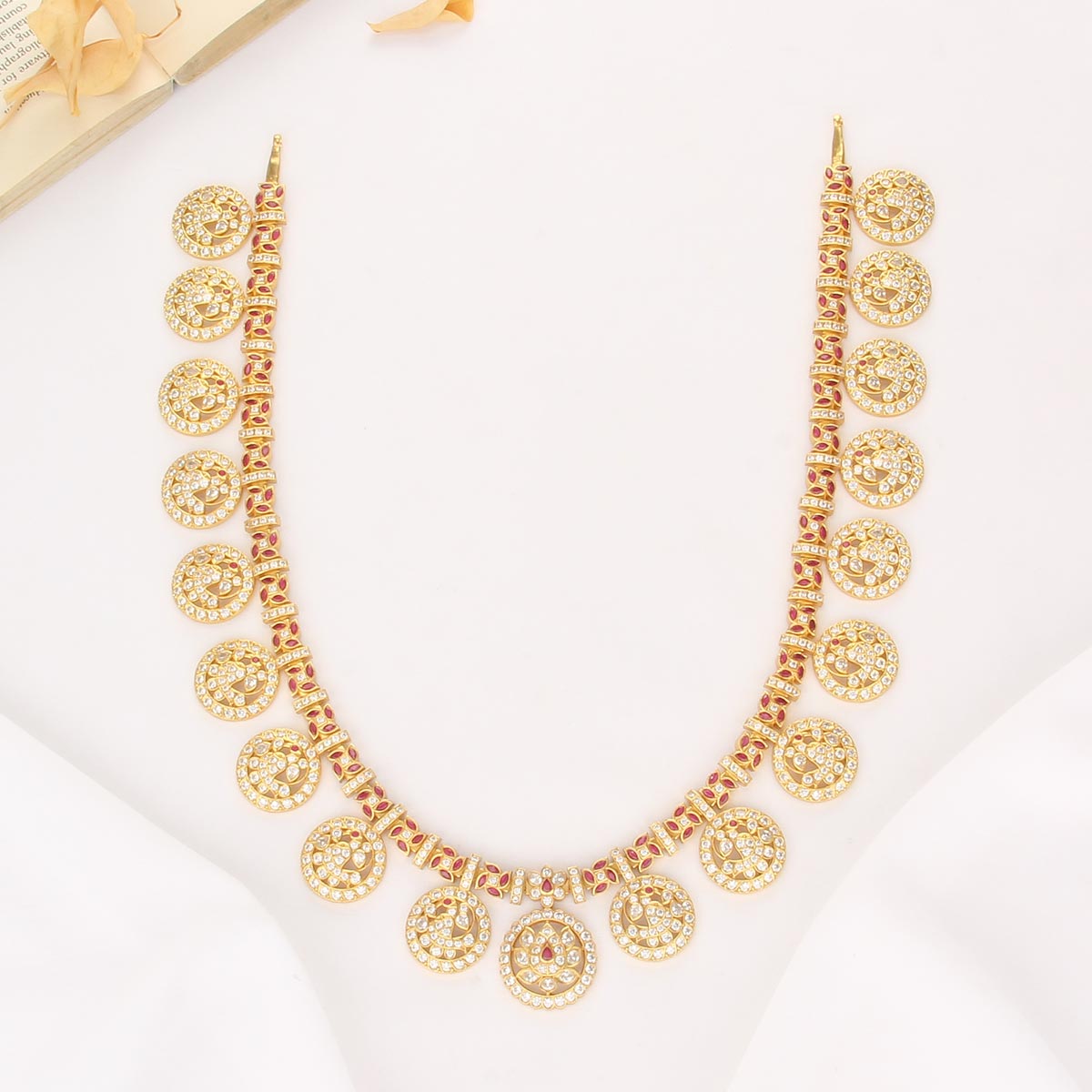 This 92.5 Silver, 24 kt gold-plated, stylish Necklace is studded with semi-precious stones to make a stunning statement. Perfect for any special occasion.