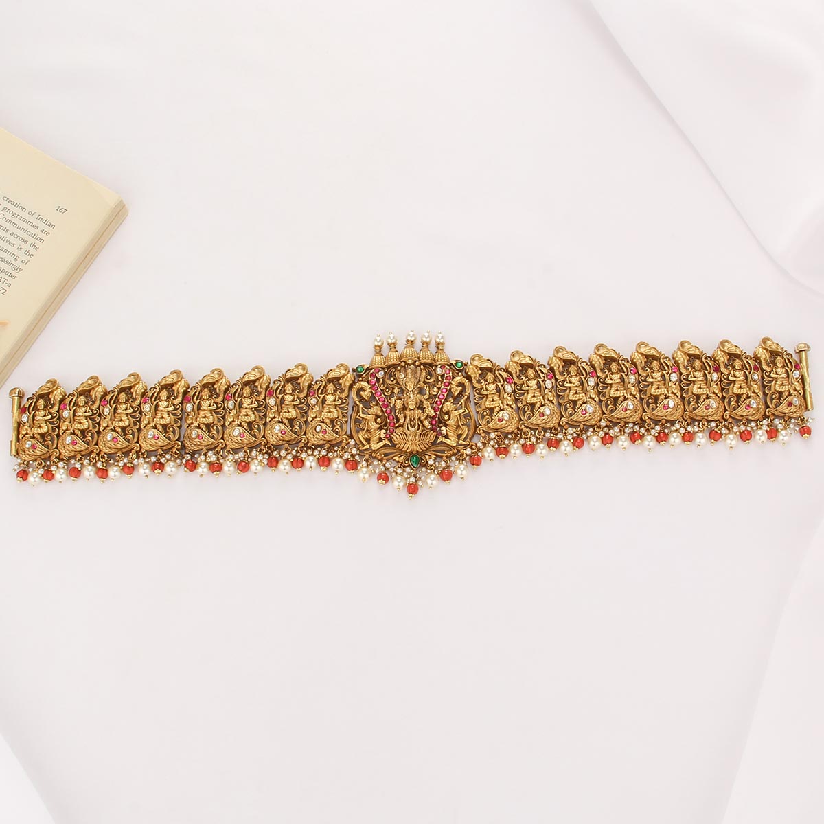92.5 gold plated nagas oddiyanam/vadanam. This is studded with Semi-Precious stones that cast an auspicious blessing on the bride.