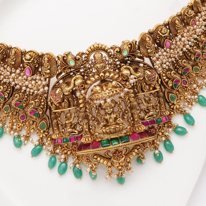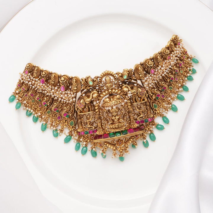 Expertly crafted from 92.5 Silver, 24kt Gold Plated, and adorned with semi-precious stones, the Majestic Look Nagas Choker Set exudes a dazzling and unparalleled design. Its breathtaking beauty is sure to make a statement of grandeur.