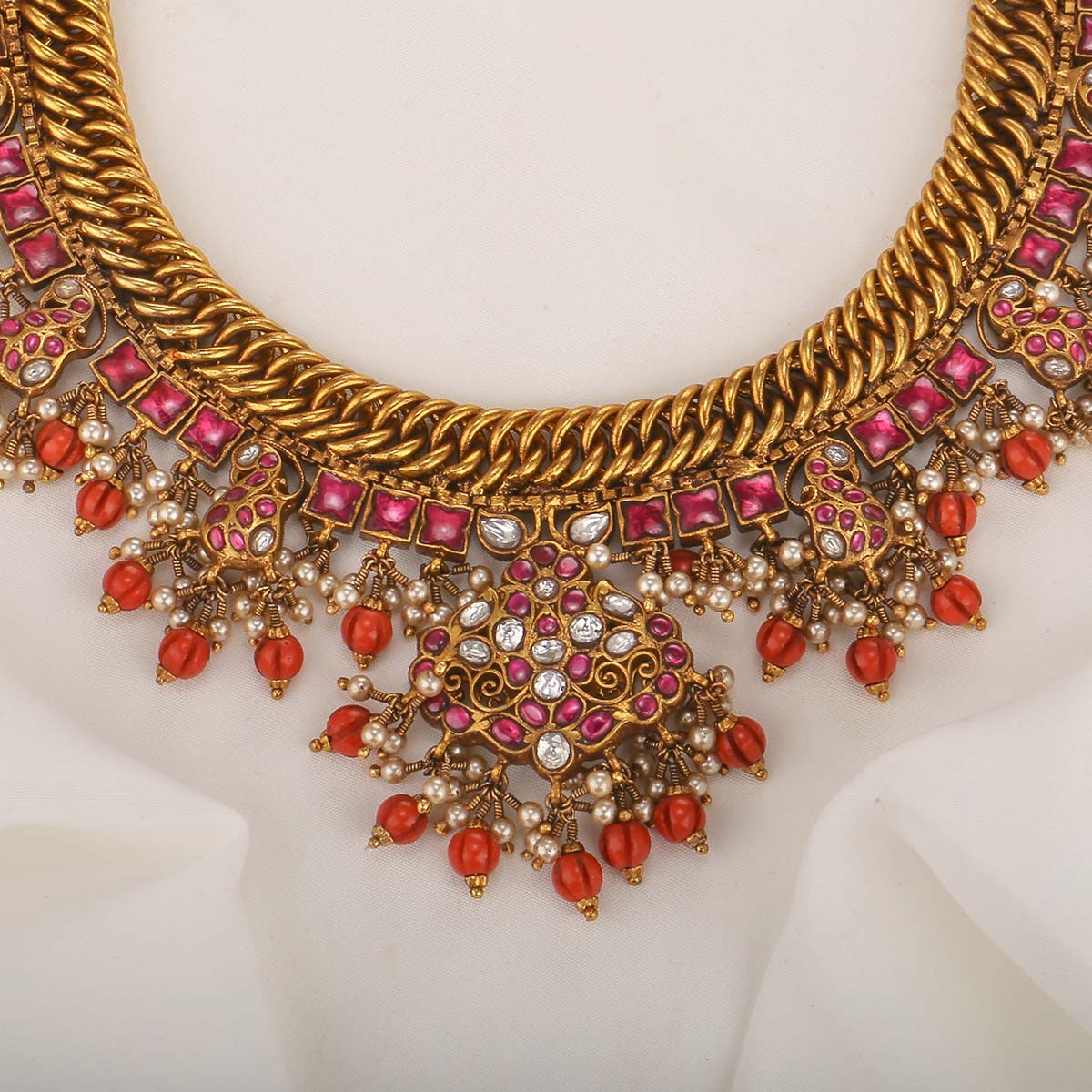 Crafted from 92.5 Silver and 24kt Gold Plated, this elegant Nagas Necklace features stunning semi-precious stones for a truly dazzling effect. Its unique design and exquisite style will undoubtedly make a grand impression.
