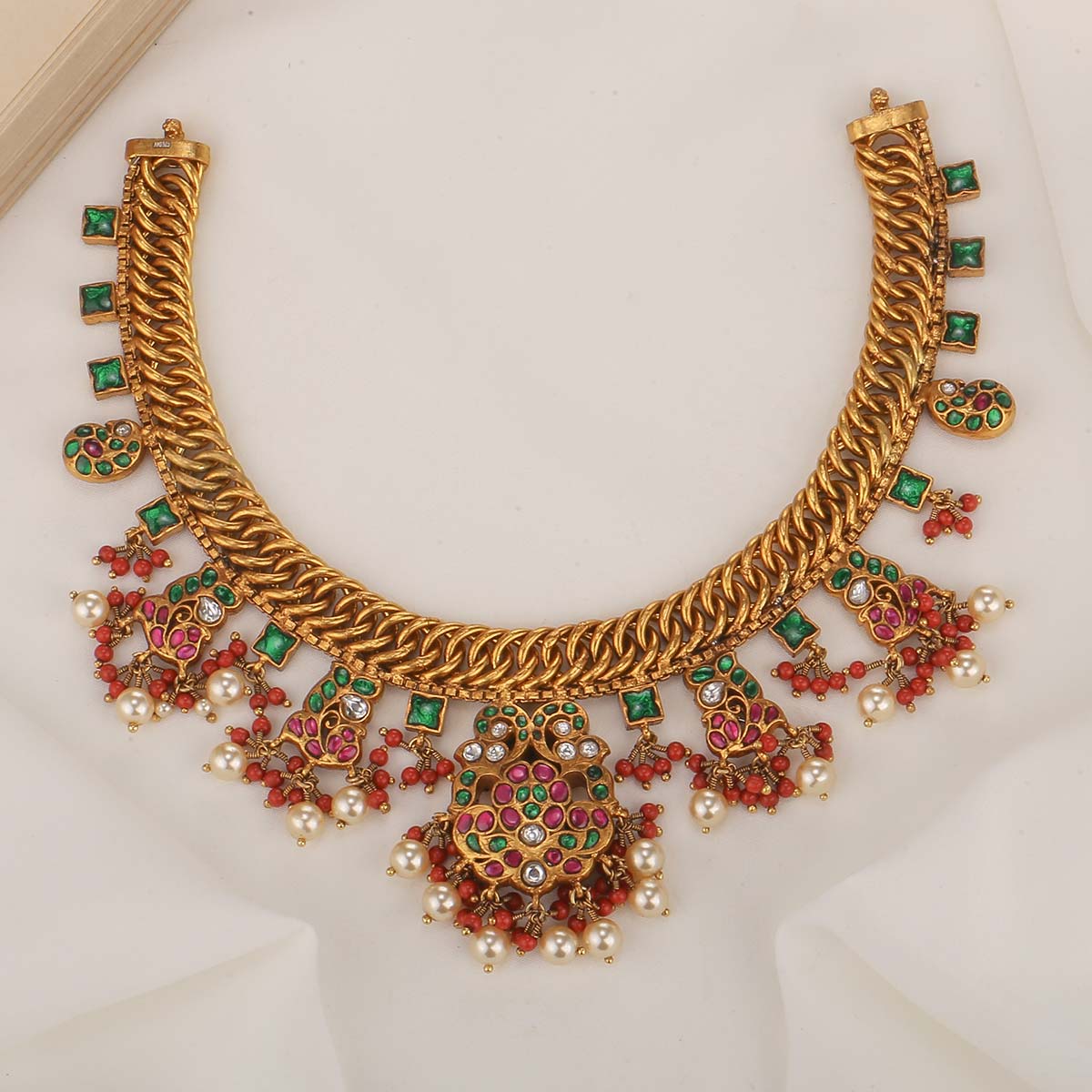 Crafted from 92.5 Silver and 24kt Gold Plated, this elegant Nagas Necklace features stunning semi-precious stones for a truly dazzling effect. Its unique design and exquisite style will undoubtedly make a grand impression.