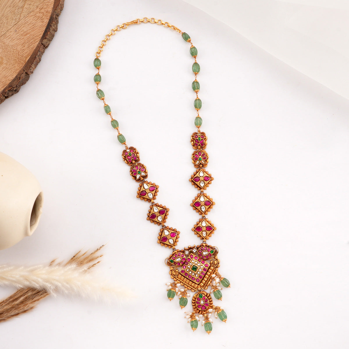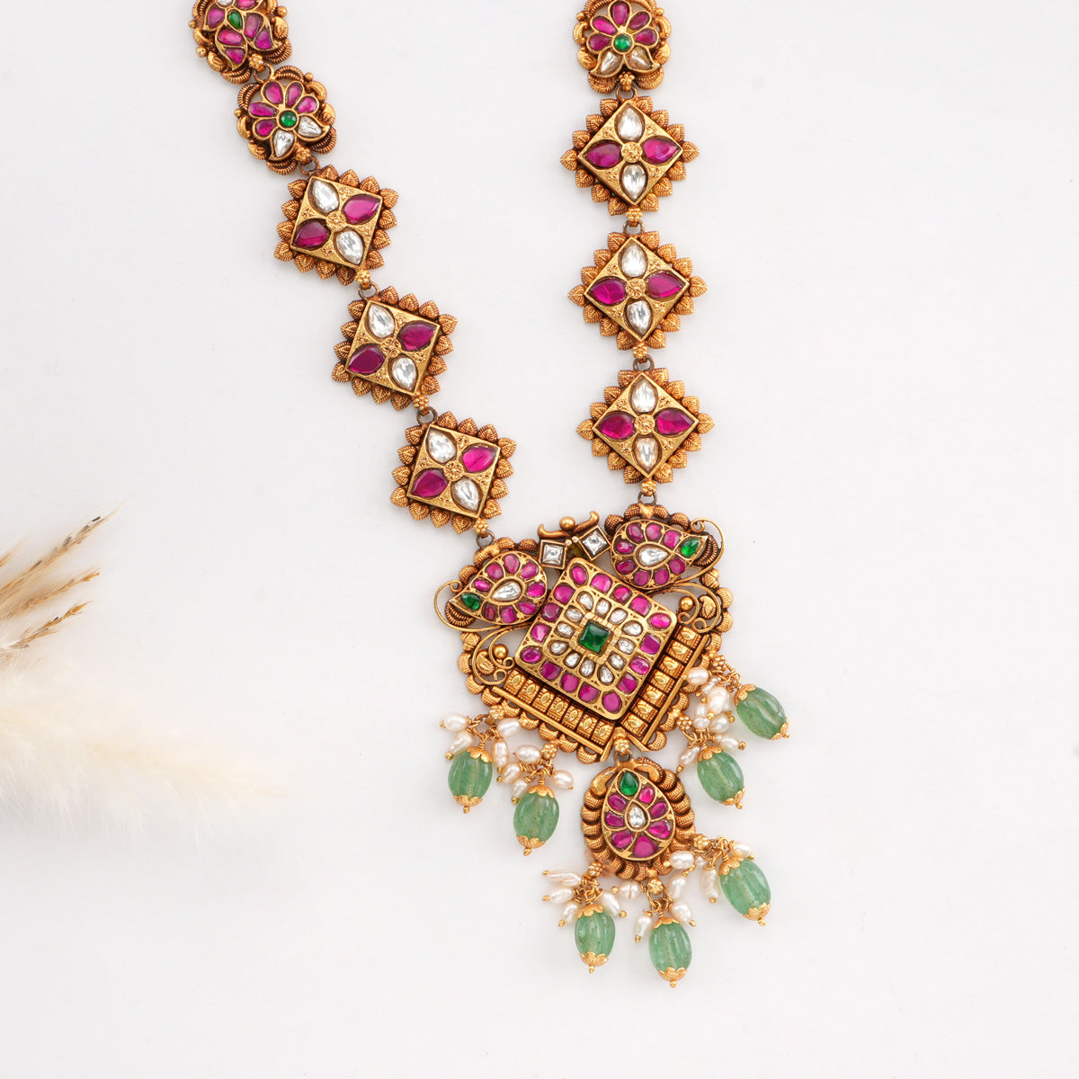 This 92.5 Silver, 24 kt Gold-Plated Necklace is adorned with Semi-precious Kundan Stones for a luxurious aesthetic.