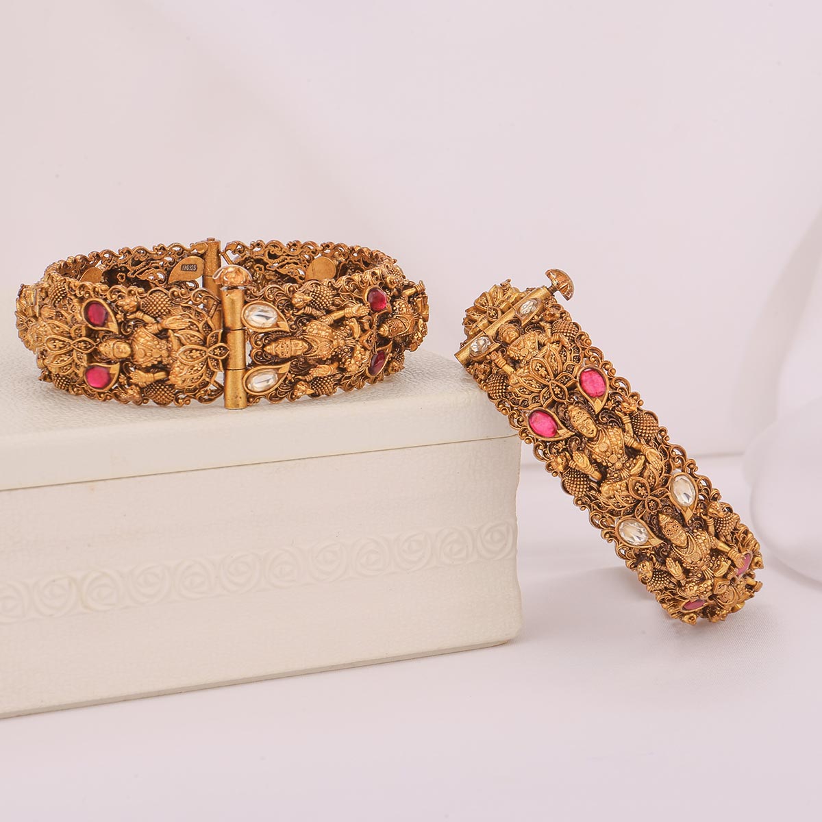 This Nagas Pair Bangle is a stunning jewellery crafted from 92.5 Silver and 24kt Gold Plating. Its intricate design is intricately studded with semi-precious stones, giving it an elegant, timeless look that adds sophistication to any outfit.