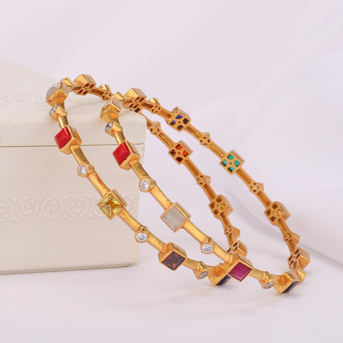 This 92.5 Silver, 24 kt gold-plated stylish Bangles is studded with semi-precious stones to make a stunning statement. Perfect for both formal and casual occasions.