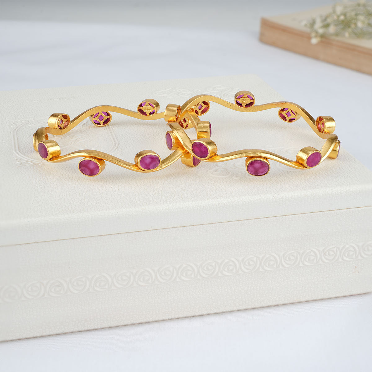This 92.5 Silver, 24 kt gold-plated stylish Bangles is studded with semi-precious stones to make a stunning statement. Perfect for both formal and casual occasions.