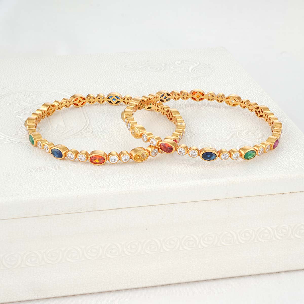 This 92.5 Silver, 24 kt gold-plated stylish Bangles is studded with semi-precious stones to make a stunning statement. Perfect for both formal and casual occasions.