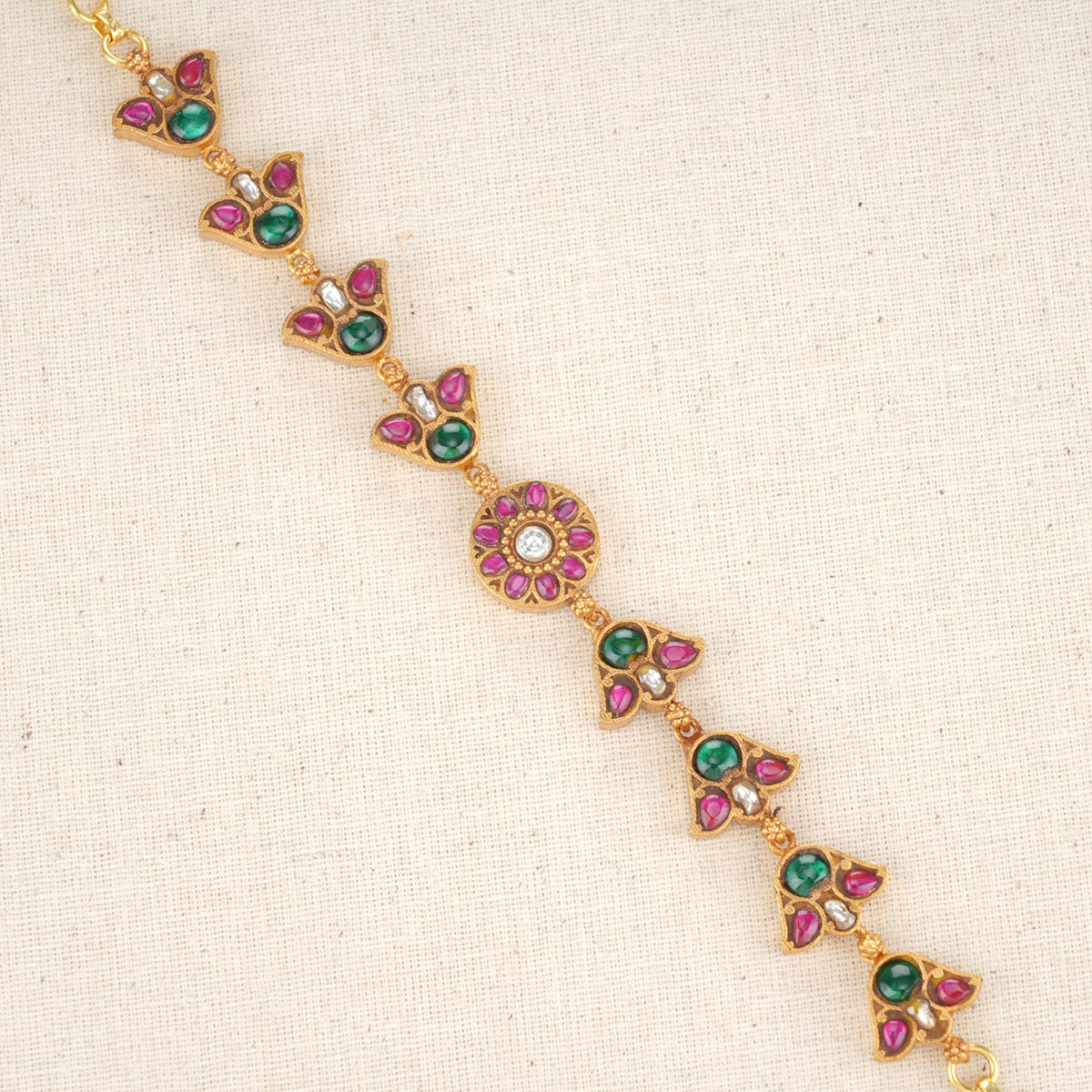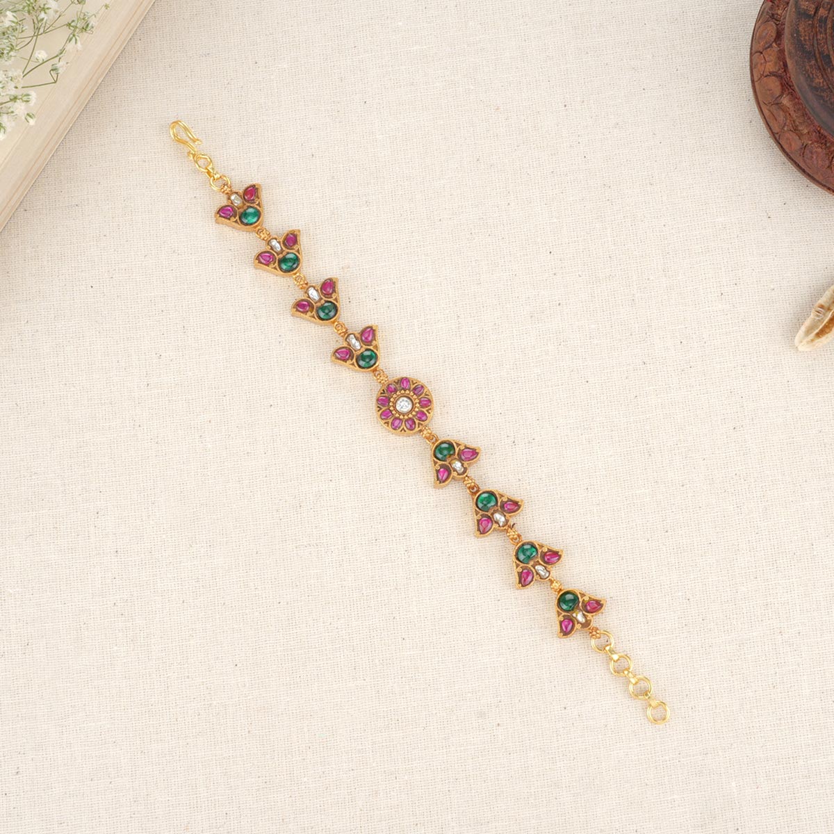 This 92.5 Silver, 24 kt Gold-Plated bracelet is adorned with Semi-precious Kundan Stones for a luxurious aesthetic.