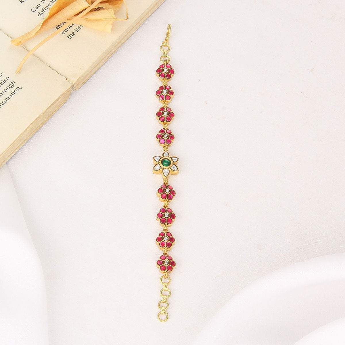 This 92.5 Silver, 24 kt Gold-Plated bracelet is adorned with Semi-precious Kundan Stones for a luxurious aesthetic.