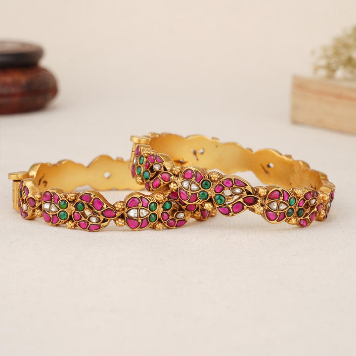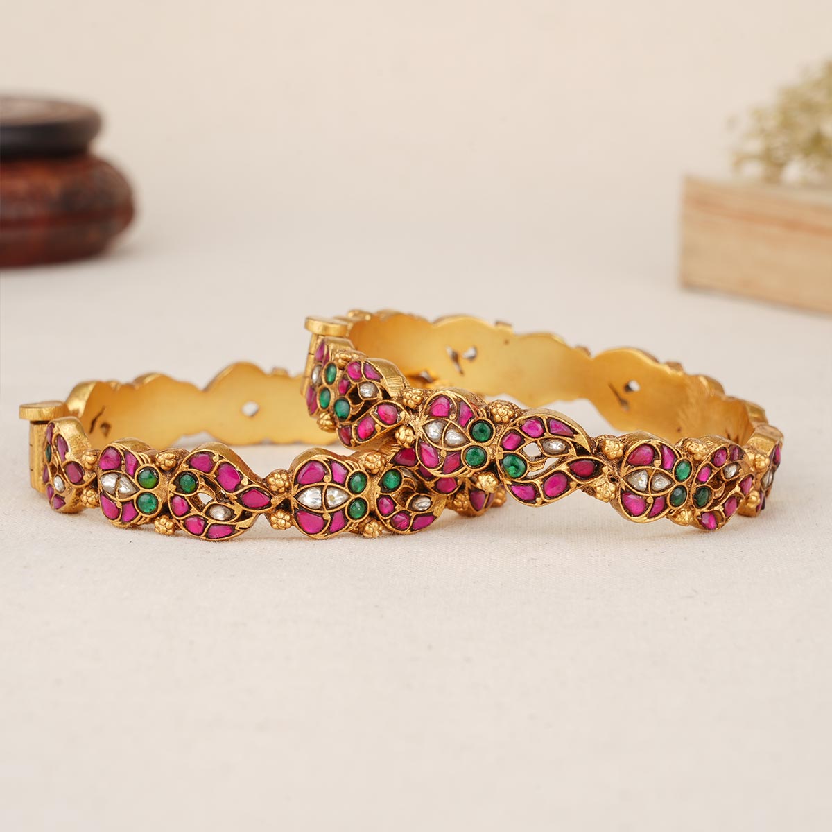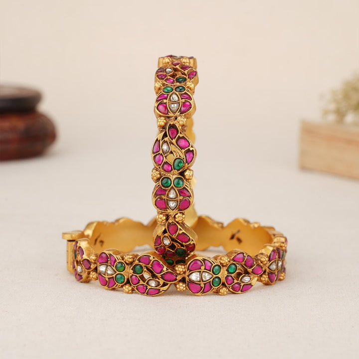 This 92.5 Silver, 24 kt Gold-Plated Bangles is adorned with Semi-precious Kundan Stones for a luxurious aesthetic.